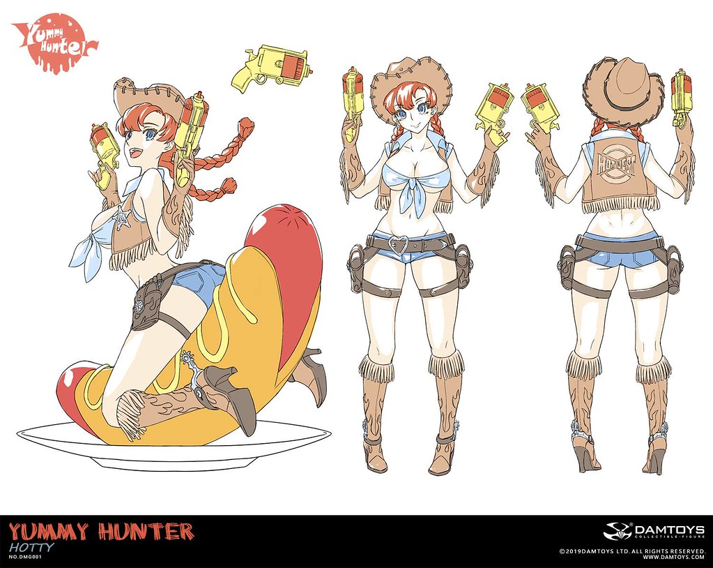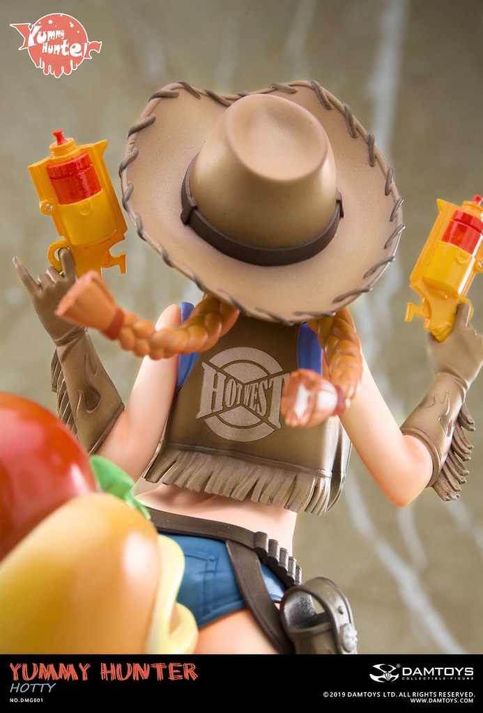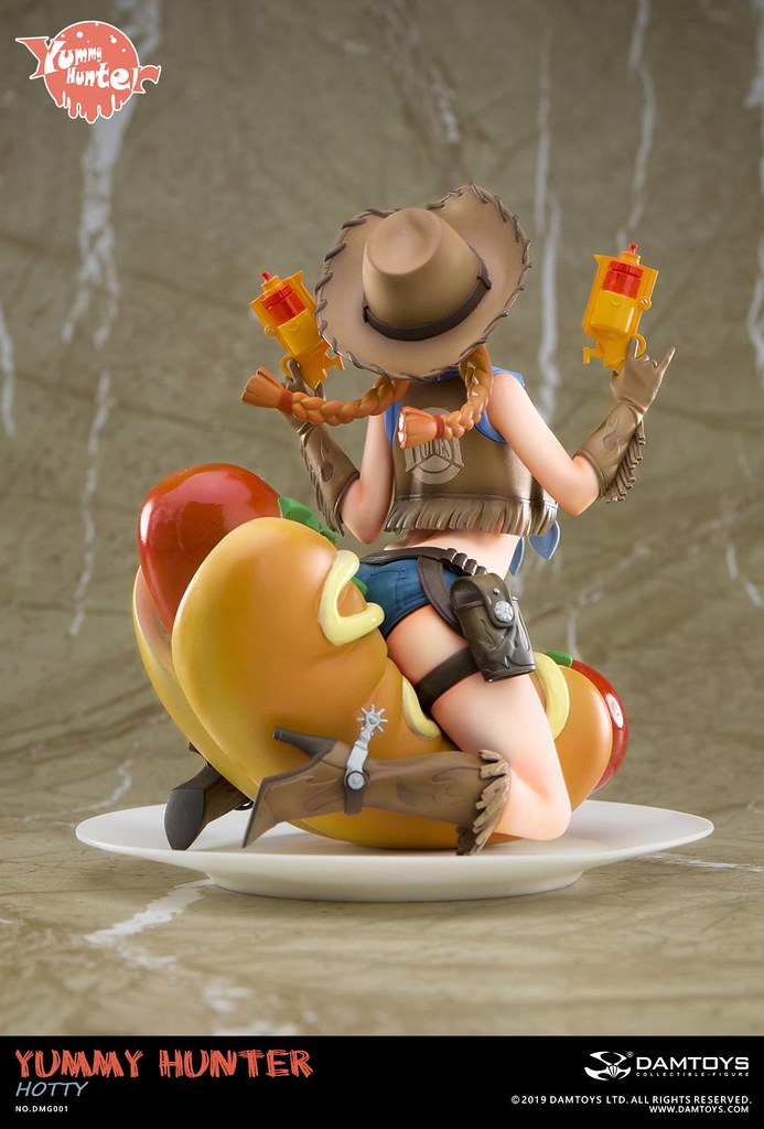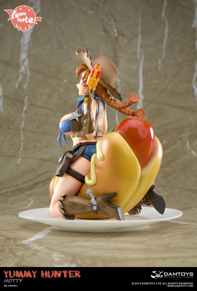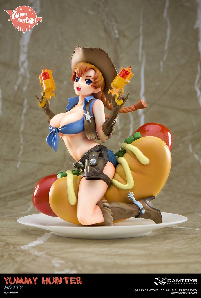 「美食獵人 Hotty」高約14 公分,將美少女、熱狗、西部......等元素結合,以ABS、PVC 等材料製作出主題性相當有趣的美少女比例模型,身穿布料極少牛仔裝的Hotty 坐在巨大熱狗上,雙手握著能射出蕃茄醬料的手槍,臉上掛著的開朗笑容與飛舞髮辮實在超級俏皮可愛~在手套、牛仔背心、牛仔靴上還做出流蘇的造型,底下的大熱狗堡則細膩形塑出因承受重量而產生的皺褶,熱狗油亮的光澤看起來非常可口,加上以盤子為題製作的底座,擺在餐桌上完全無違和呢!