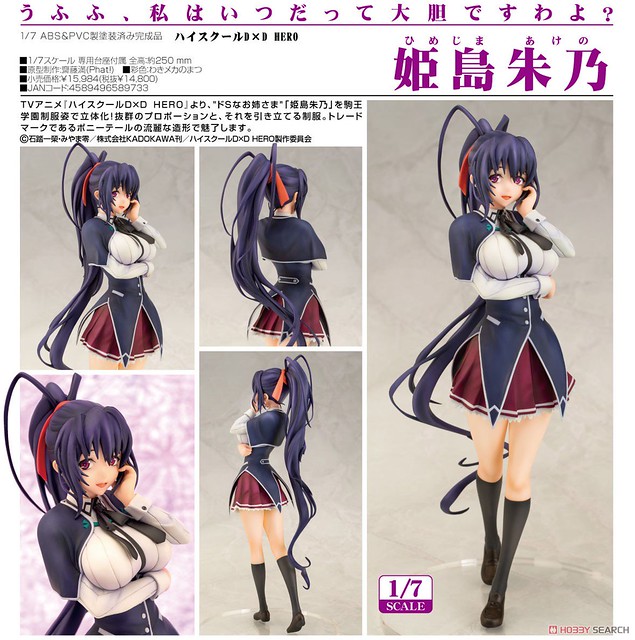 專門推出精緻美少女上色完成作品的日廠Phat!(株式会社 ファット・カンパニー)玩具公司,這次將以電視動畫《惡魔高校DXD HERO》為題材來推出「姬島朱乃」的1/7比例上色完成品,劇中有著“虐待狂大姐”稱呼的「姬島朱乃」此次以身穿駒王學園的制服來呈現,有著一頭柔順馬尾以及佼好的身材讓學生制服都快包不住了,喜愛《惡魔高校D×D》系列作品的玩具人可以參考一下歐!