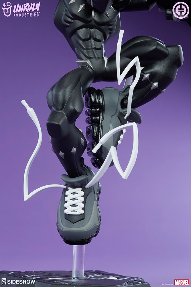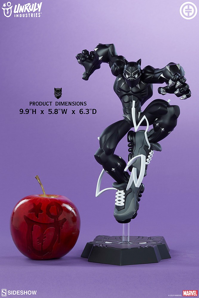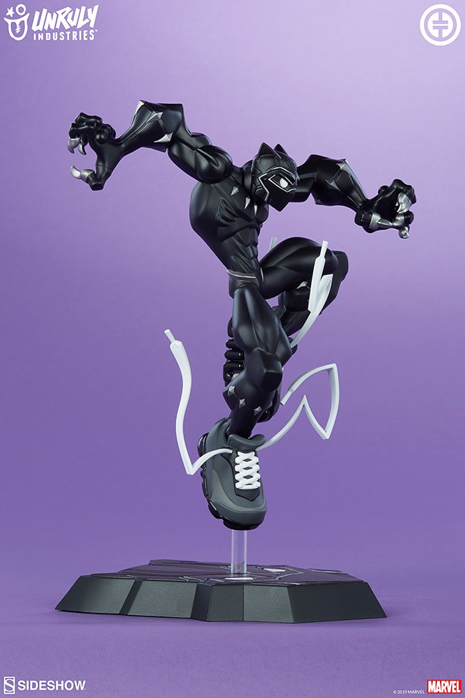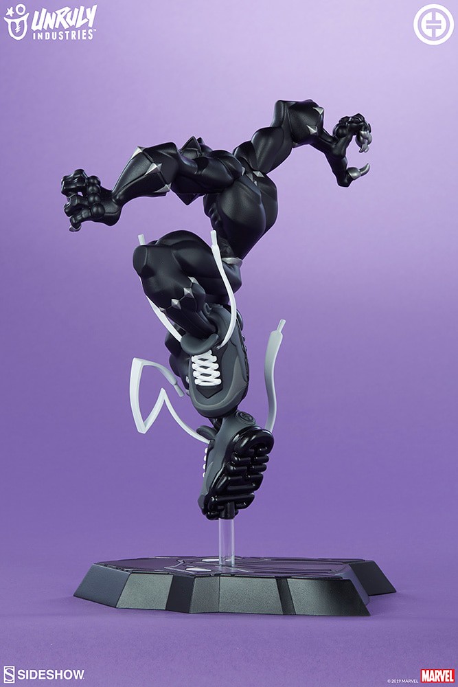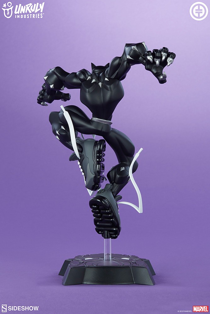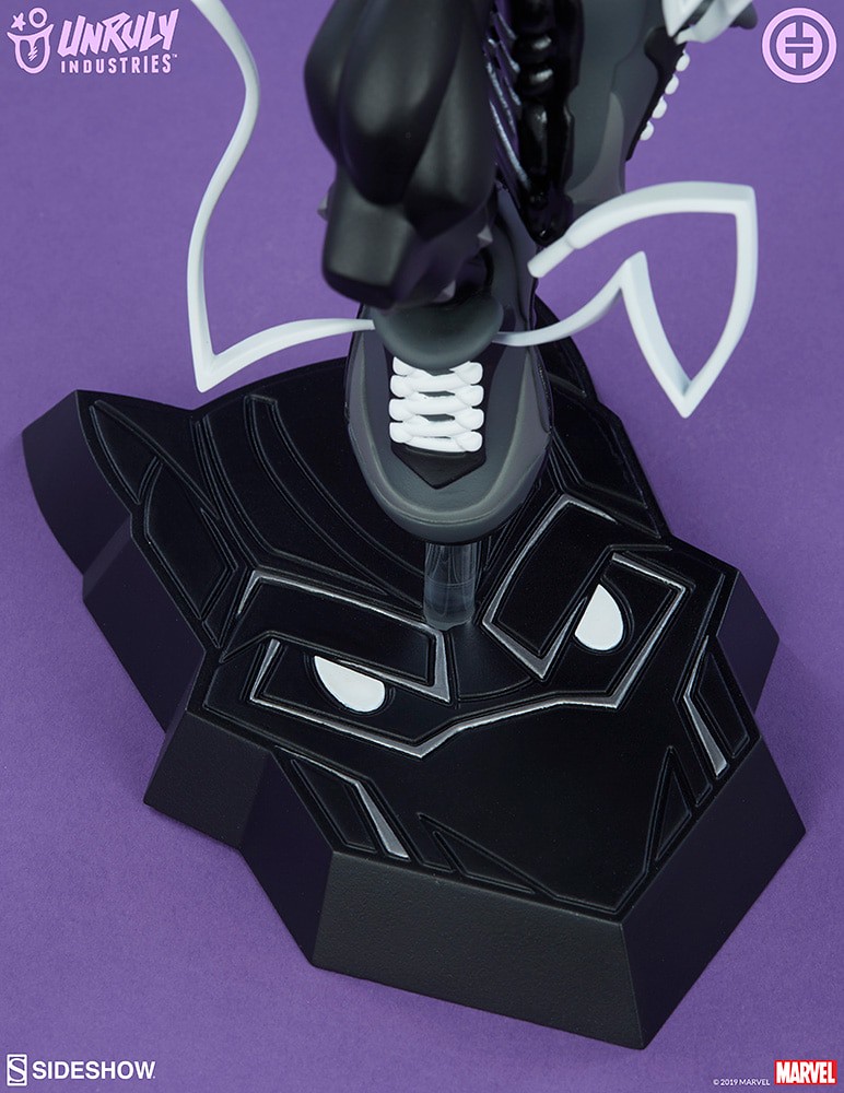 「Unruly Industries 帝查拉 by Tracy Tubera」高約25.1 公分,呈現出彷彿準備突襲敵人的戰鬥姿態,大幅度的動作加上誇張的身形與塊狀肌肉線條,使本作極具張力!銀色首飾、利爪......等戰衣細節考舊地還原,而腳上的運動鞋則是採用與本體保有一致調性的黑灰白配色,飄動的鞋帶使人感受到帝查拉一躍而下的速度感!值得一提的是,展示底座也是以Tracy Tubera 風格的黑豹頭像來製作的喔!