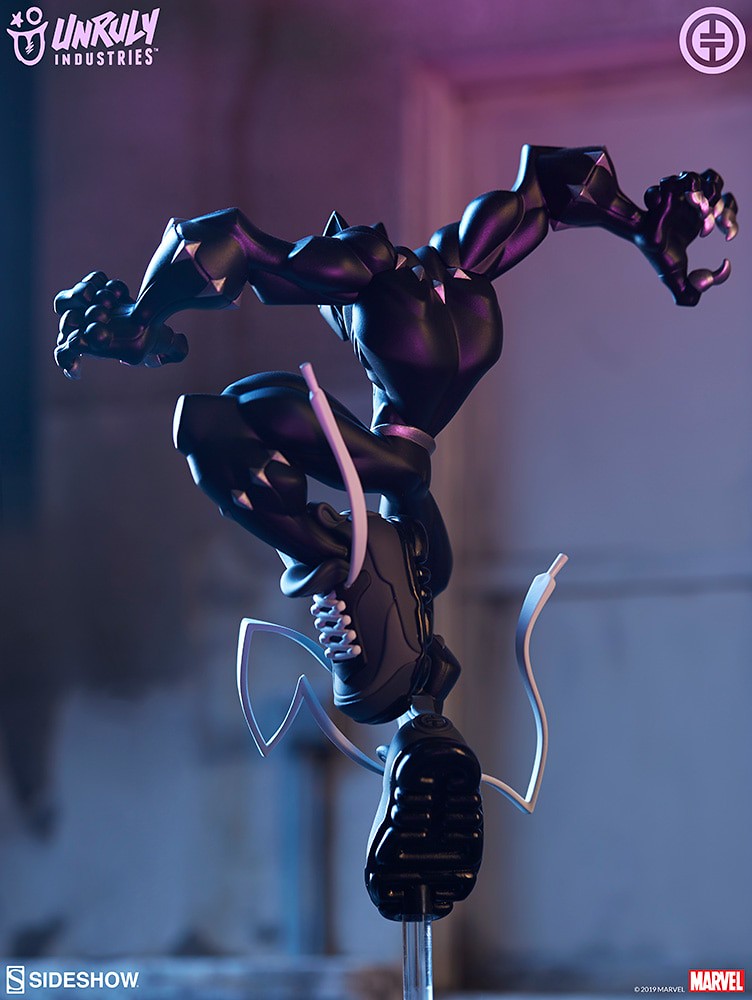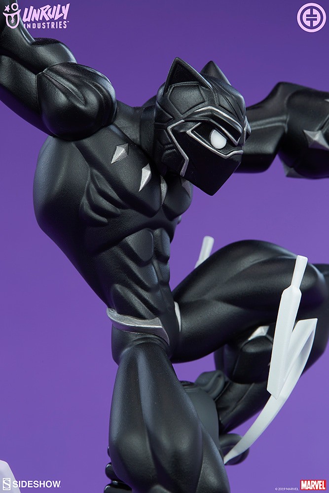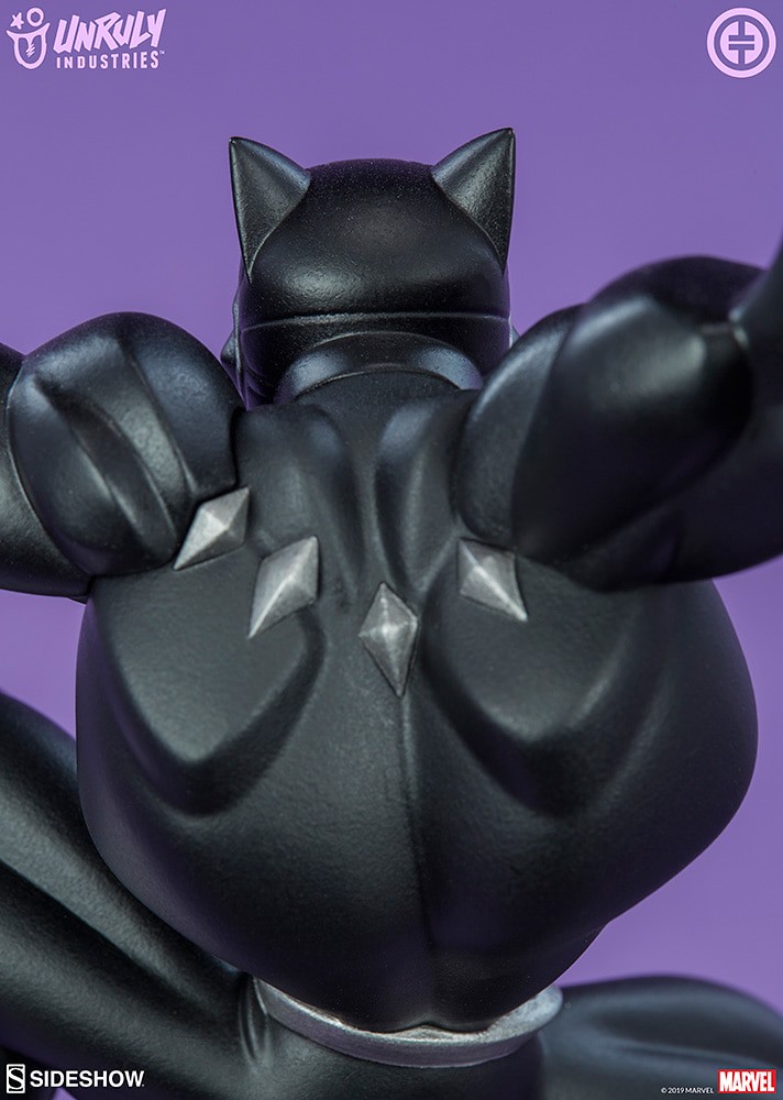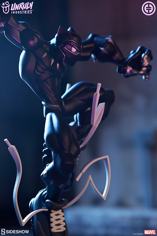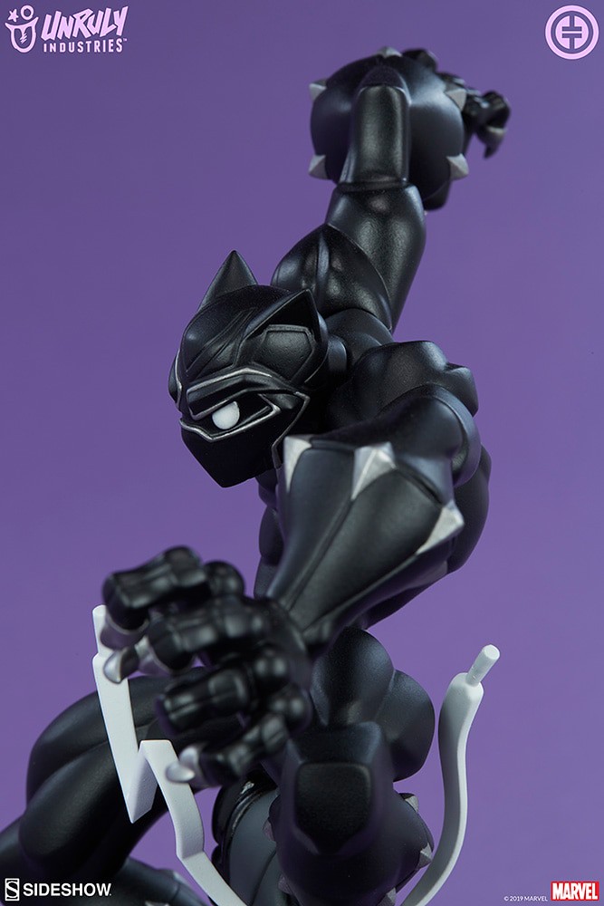 「Unruly Industries 帝查拉 by Tracy Tubera」高約25.1 公分,呈現出彷彿準備突襲敵人的戰鬥姿態,大幅度的動作加上誇張的身形與塊狀肌肉線條,使本作極具張力!銀色首飾、利爪......等戰衣細節考舊地還原,而腳上的運動鞋則是採用與本體保有一致調性的黑灰白配色,飄動的鞋帶使人感受到帝查拉一躍而下的速度感!值得一提的是,展示底座也是以Tracy Tubera 風格的黑豹頭像來製作的喔!