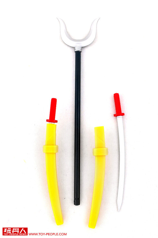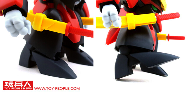 ▼ 再來就是武器的部份,如同一開始發表的官圖,槍頭、刀身皆使用金屬銀來塗裝加強質感,但刀鞘就真的可惜沒塗成天線一樣的金色,膠感頗重。