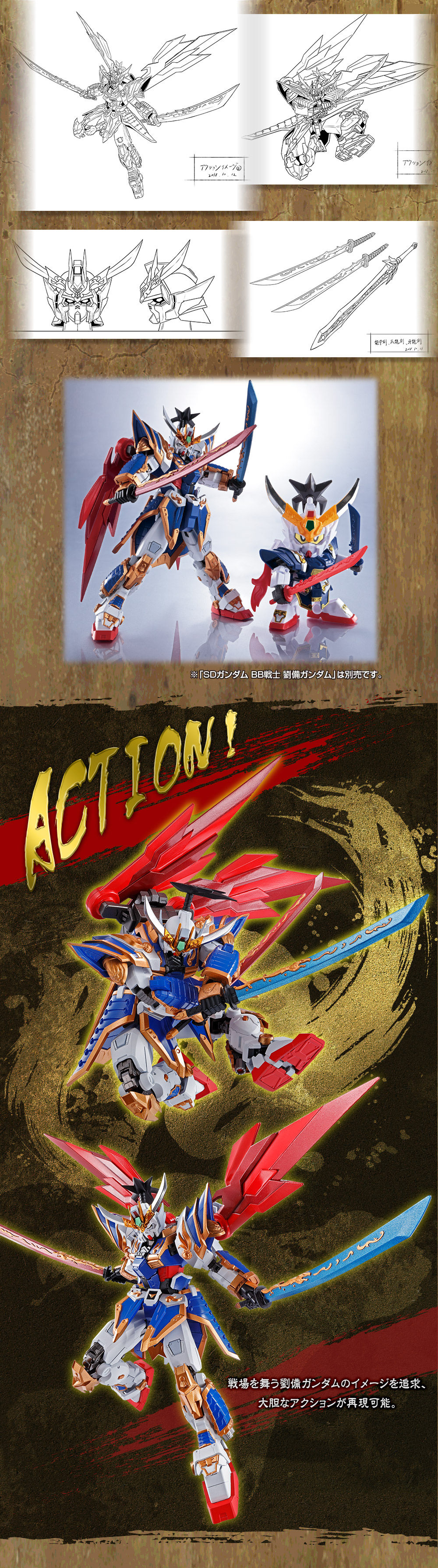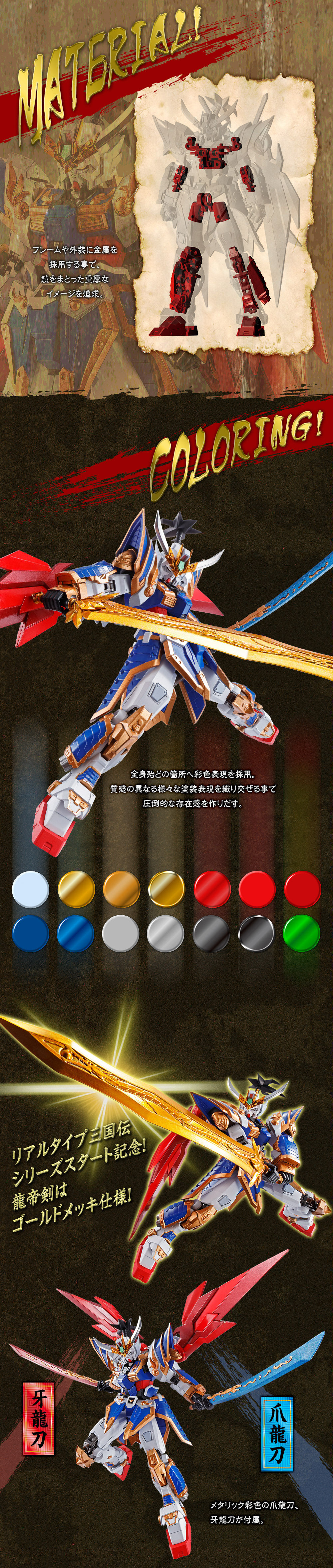 「METAL ROBOT魂 劉備鋼彈(REAL TYPE ver.)」為追求在戰場上揮舞「爪龍刀」、「牙龍刀」、「龍帝劍」,姿態極為動感的劉備,參考了動畫風格的畫稿進行設計,部份骨架與裝甲使用合金材質製作呈現厚重感,全機更施以大量的金屬色塗裝,「龍帝劍」則鍍上閃亮的金色,極為豪華。透過全身高度可動的關節構造就能把玩出帥氣姿勢。同時也預告下一彈將推出「紅蓮的霸將軍」曹操鋼彈(REAL TYPE ver.)!