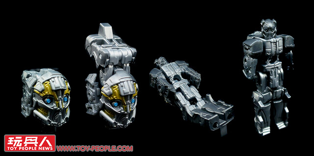 ▼No. 41「廢鐵屑」(Scrapmetal),登場於電影第二集《變形金剛:復仇之戰》(Transformers: Revenge of the Fallen)。與工程金剛(Constructicons)們及解剖刀(Scalpel)等狂派成員參與了密卡登(Megatron)的北大西洋海底救援作戰,最後被強迫犧牲奉獻出零件(“Need parts. Kill ze little one!”),成功將密卡登復活。本次的玩具乃是根據美術設定稿重新開模而生,並賦予了組合為狂派合體金剛「蹂躪者」(Devastator,或譯作大力神)的機構,藉以重現劇情末段的沙漠金字塔大戰(註)。在包裝方面值得一提的,就是過去不論是博派狂派,盒側一律使用博派的標誌,本次竟特別更換為蹂躪者的臉部線稿,是個相當有趣的小彩蛋。