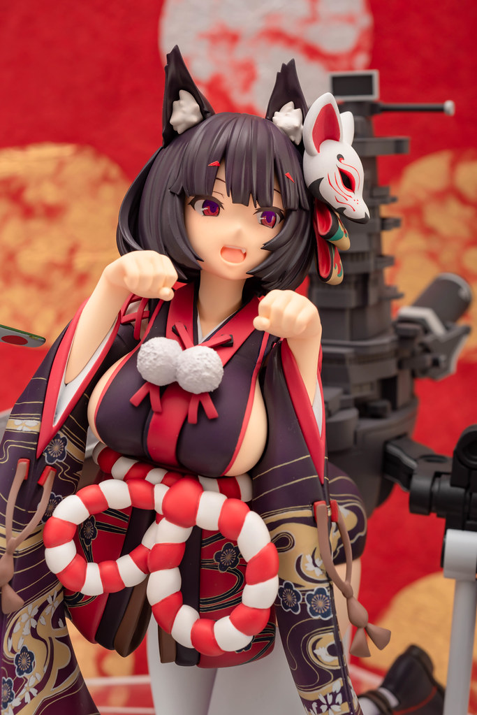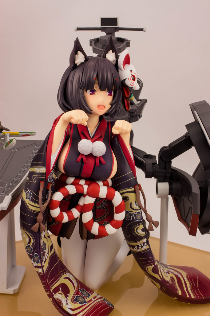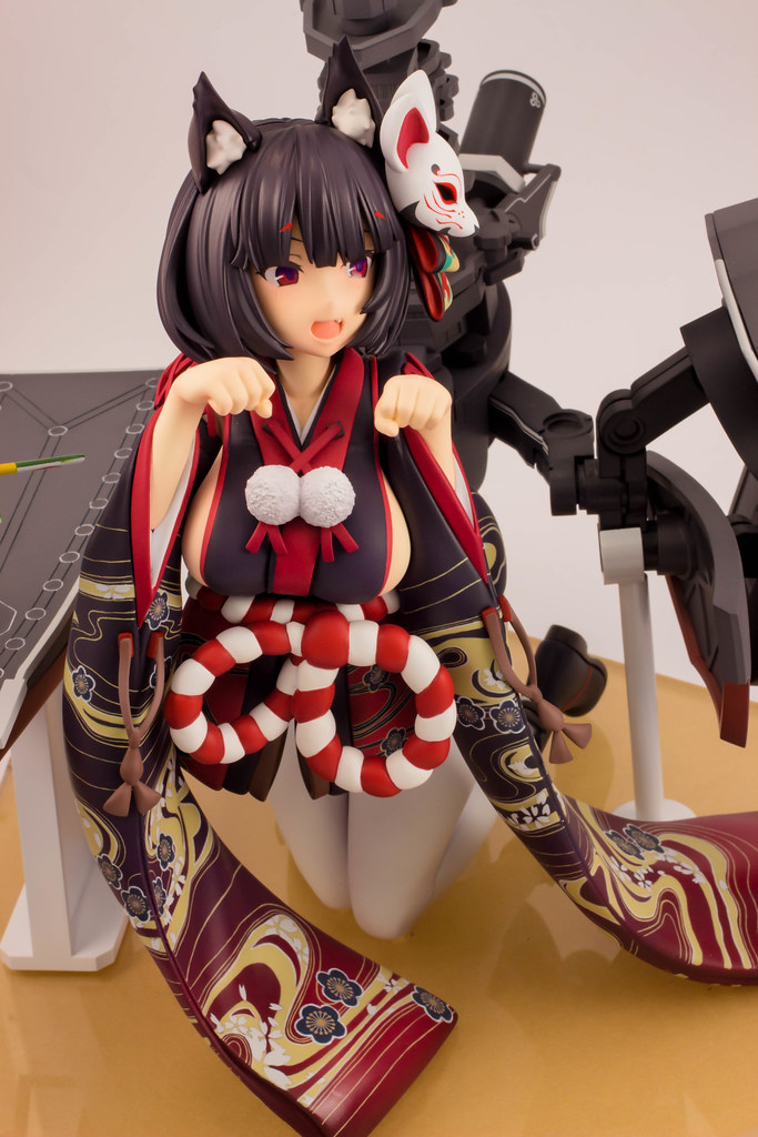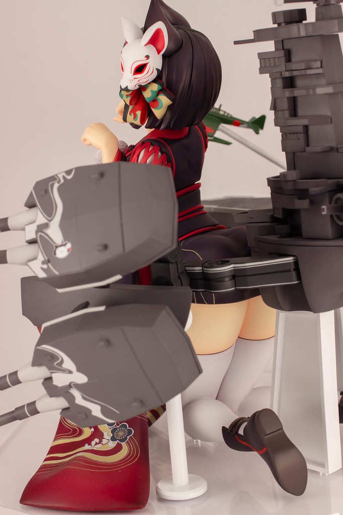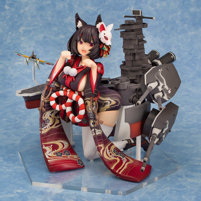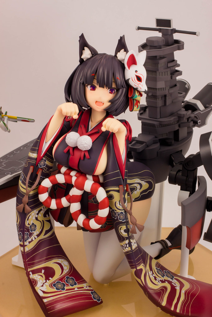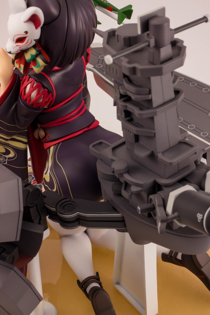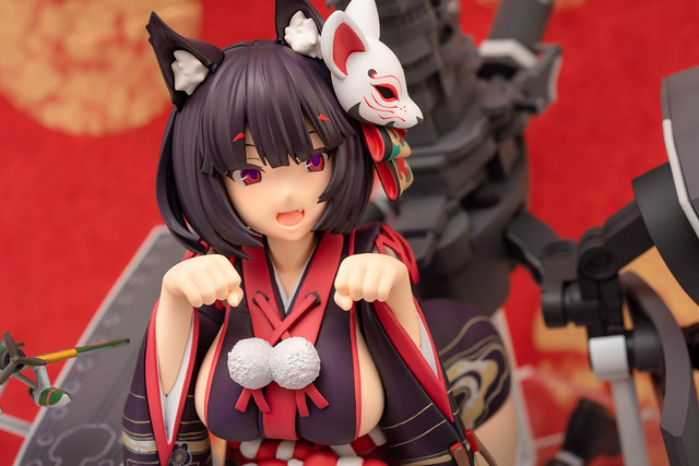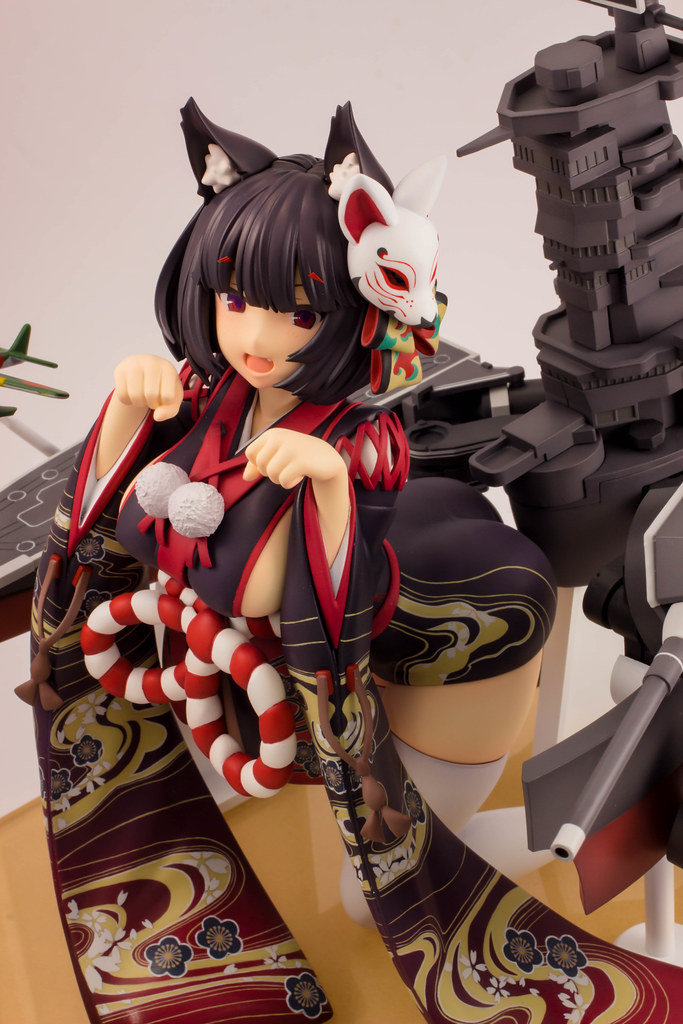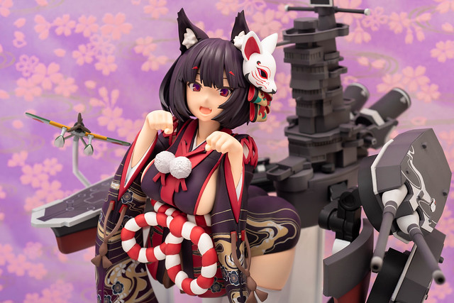 由 PLUM 推出的「山城改 1/7比例模型」以遊戲中 Rain Lan 繪製的角色插畫為基礎製作,擁有寶石般的瞳孔、露出虎牙的無敵笑容,搭配貓咪般的姿勢超級可愛!狐面頭飾、和服細節皆雕塑出細膩造型,並以精緻印刷再現和服華麗花紋,豐滿的臀部曲線與白絲大腿也更加誘人。艤裝部份則重現了扶桑級特徵的「疊疊樂艦橋」,砲口周圍施以舊化處理,一旁也附上了起飛的「瑞雲」。