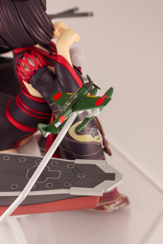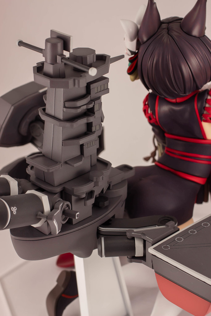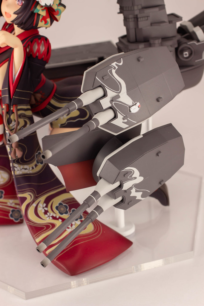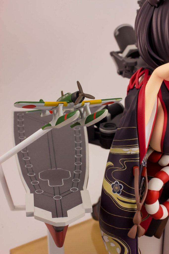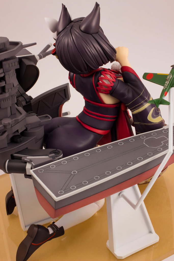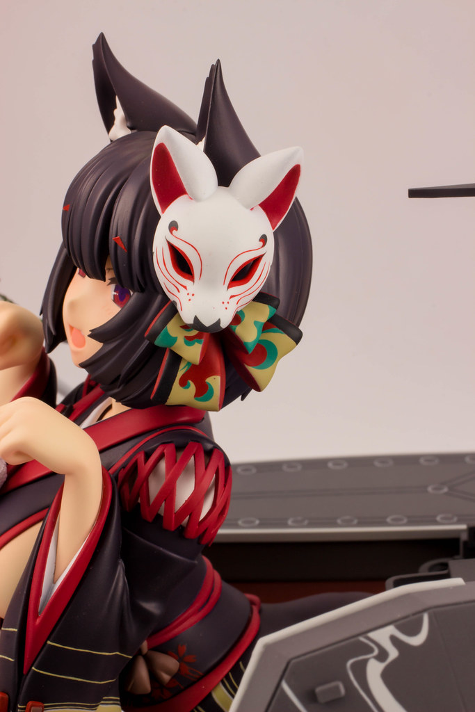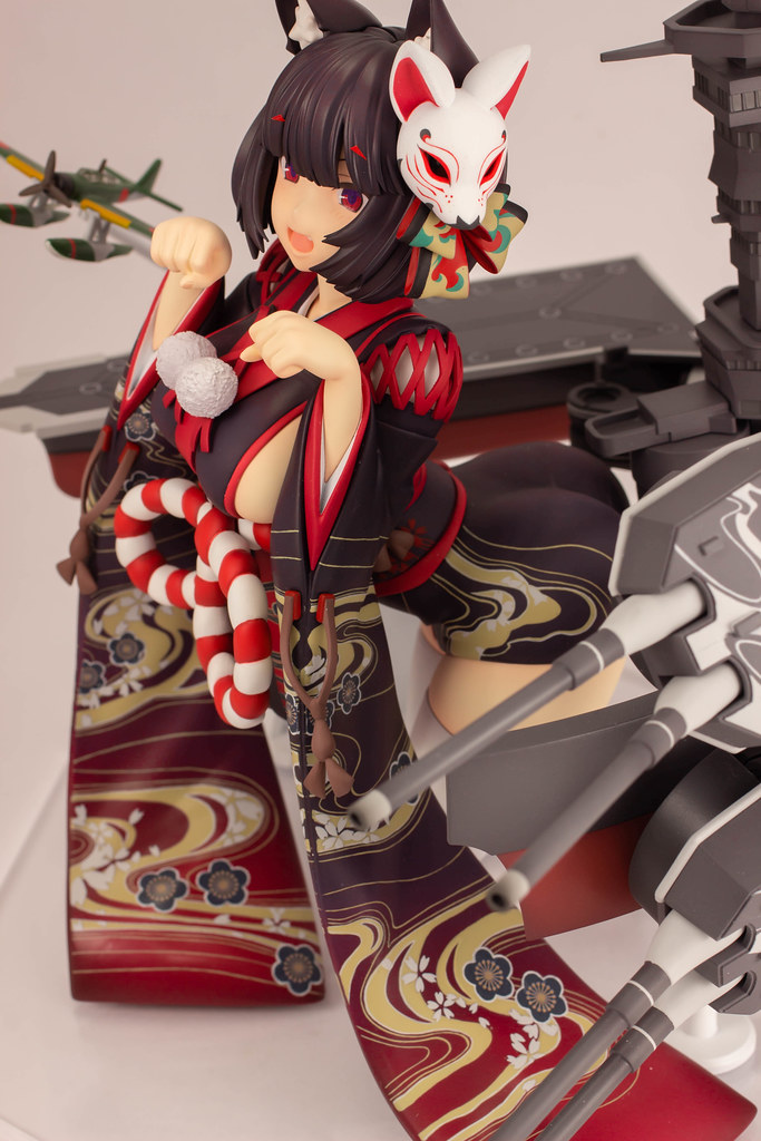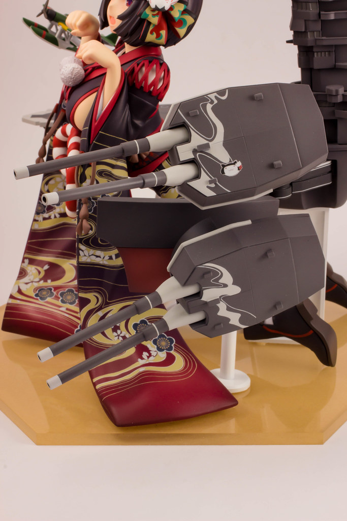 由 PLUM 推出的「山城改 1/7比例模型」以遊戲中 Rain Lan 繪製的角色插畫為基礎製作,擁有寶石般的瞳孔、露出虎牙的無敵笑容,搭配貓咪般的姿勢超級可愛!狐面頭飾、和服細節皆雕塑出細膩造型,並以精緻印刷再現和服華麗花紋,豐滿的臀部曲線與白絲大腿也更加誘人。艤裝部份則重現了扶桑級特徵的「疊疊樂艦橋」,砲口周圍施以舊化處理,一旁也附上了起飛的「瑞雲」。