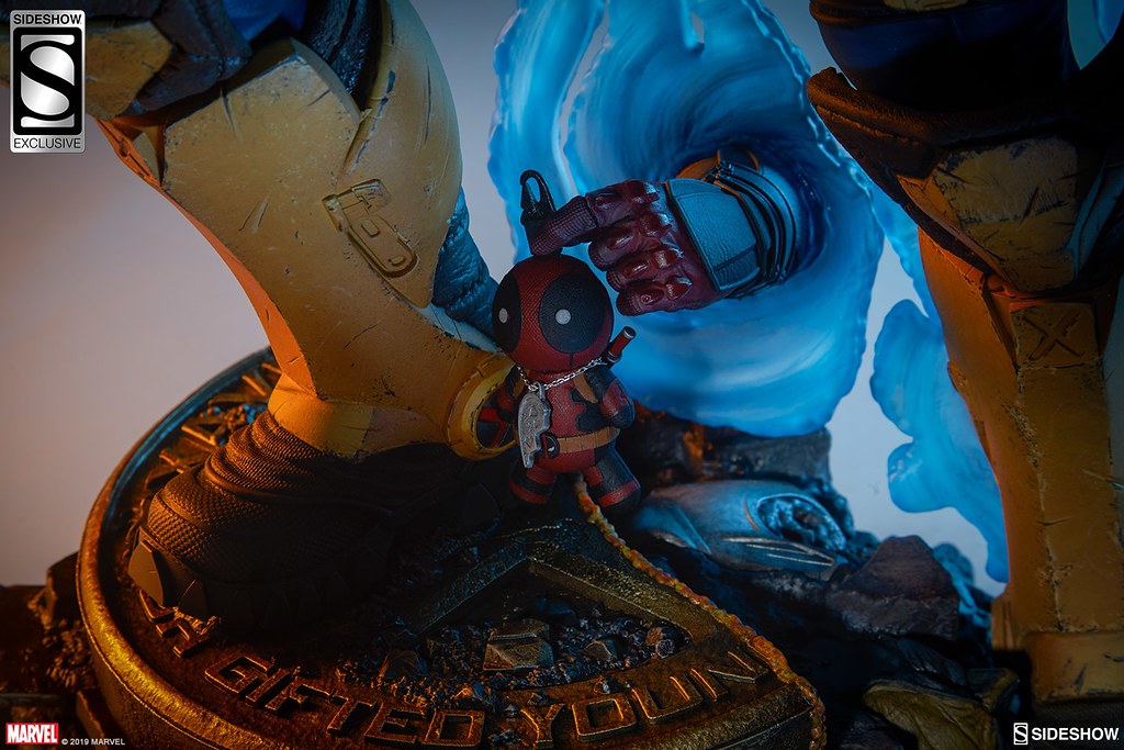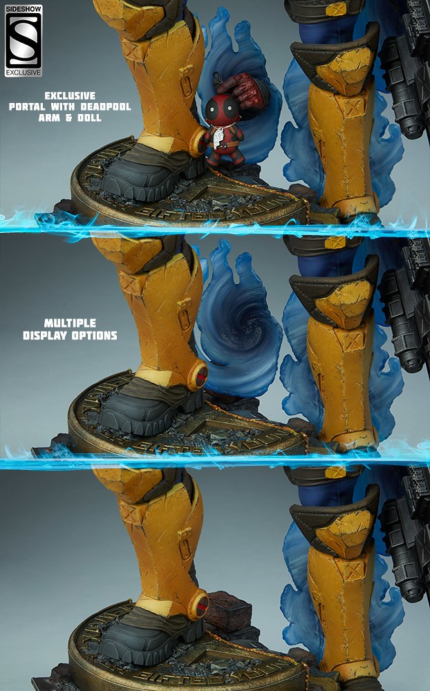 「Premium Format™ Figure 機堡」高約62.2 公分,藉著雙手持握的巨大雙槍以及身後的通道特效,完美詮釋了機堡身為穿梭時空的優秀戰士角色設定!從頭雕、被機械侵蝕的左眼、銀色的機械左臂、肌肉形狀,貼身戰衣與武器配備都施以精緻的造型刻畫,裝備的戰損處理十分寫實,破舊的布料披風還可以取下,展示起來更具變化性!EX版還追加了從時空通道中冒出來、拿著死侍娃娃的死侍左手,超爆笑啊!