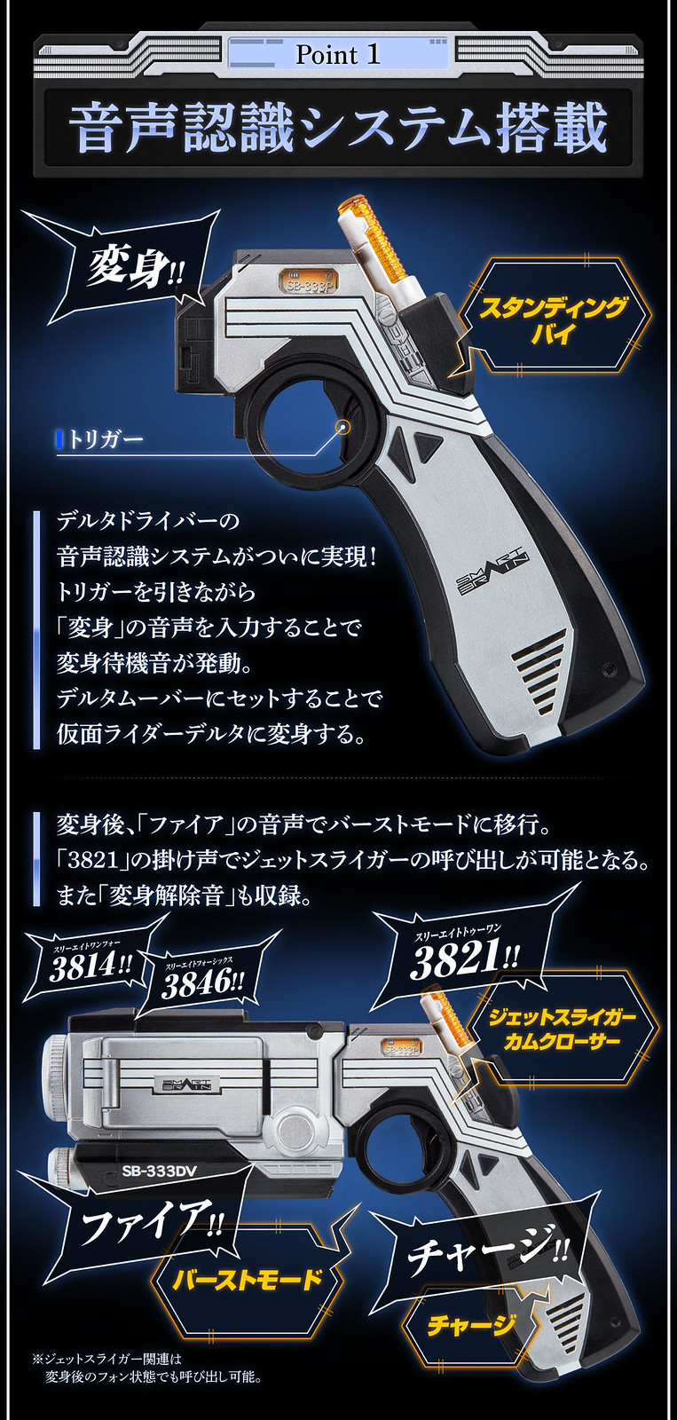 此次再現了劇中「Delta Gear」的聲音辨識系統,在遊玩時以日文說出「變身(HENSIN)」就會自動發出變身準備音效、說出「開火(FIRE)」即進入射擊模式、呼喊「3821」召喚機車 Jet Sliger...等。