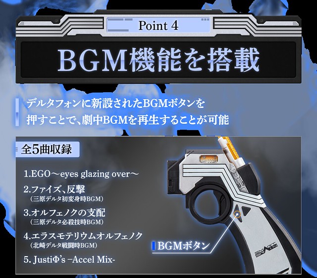 Delta Mover 內搭載 LED 燈,在施展必殺技「Lucifer Hammer」時便會如同劇中般從槍口投影出紫色的 Δ 標誌,同時也透過無線裝置連動腰帶,讓腰帶發光。