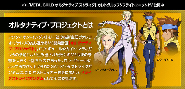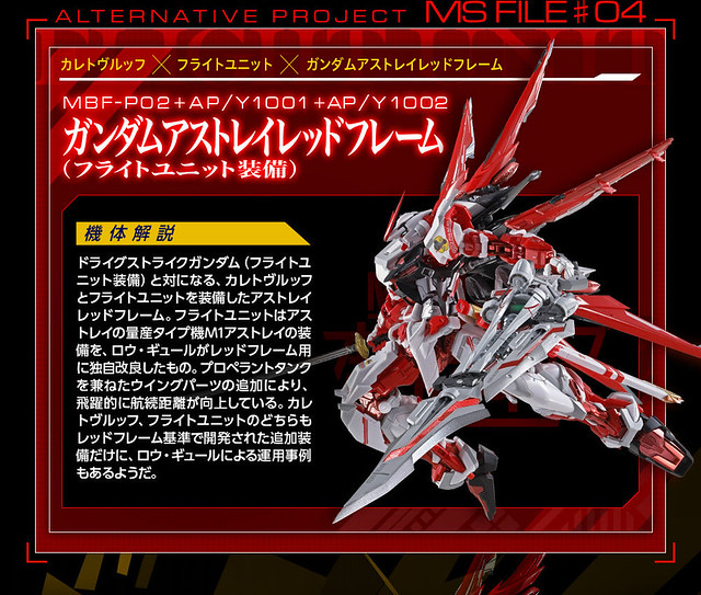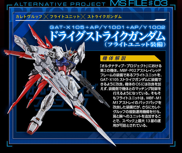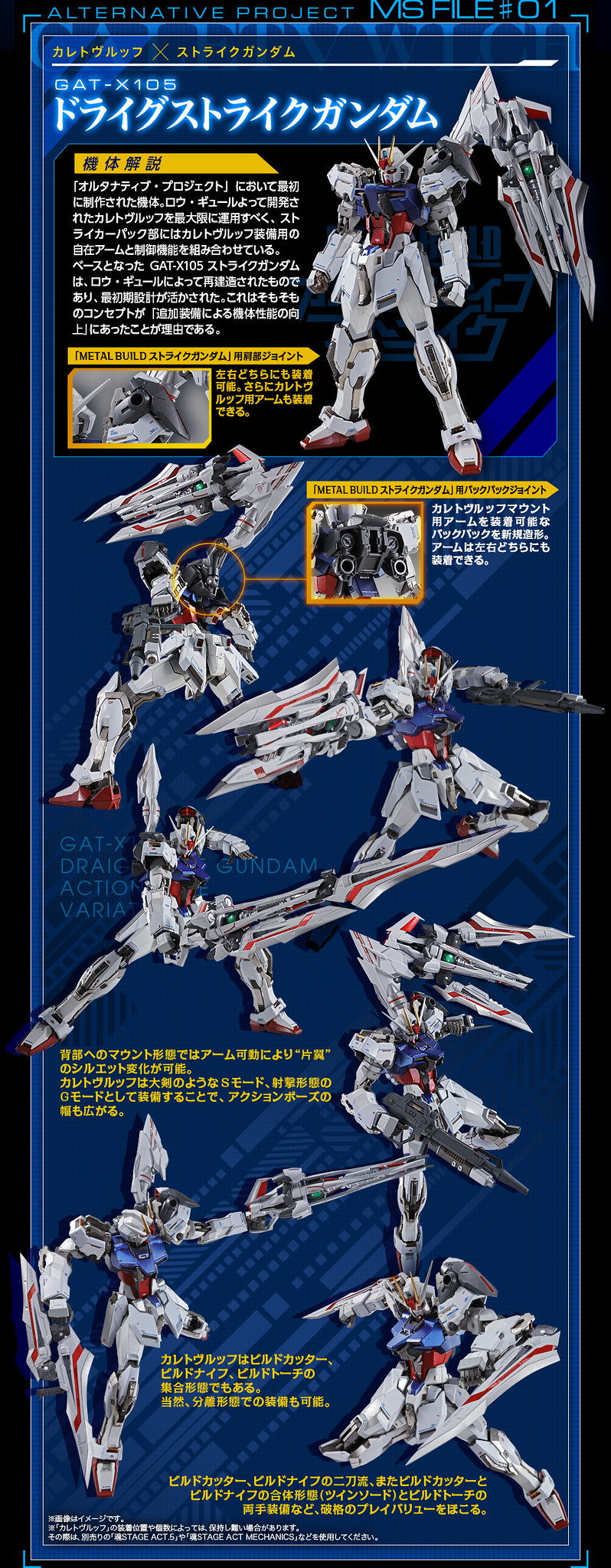 METAL BUILD 原創 MSV 企劃『METAL BUILD ALTERNATIVE STRIKE』在設定中是阿克泰昂產業社技術主任、外號「雙V」的瓦勒良.瓦勒里所進行的 MS 開發計畫「ALTERNATIVE PROJECT」,將再次建造的「GAT-X105 攻擊鋼彈」與回收商「羅・裘爾」的技術結晶「烈雷劍」、「飛行組件」結合,誕生出秘藏通往次世代可能性,「異端」的攻擊鋼彈『紅龍型攻擊鋼彈(暫譯,日:ドライグストライクガンダム)』。