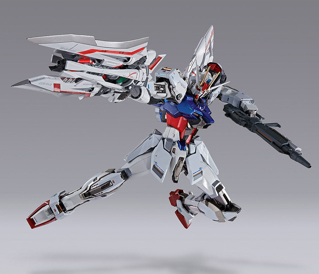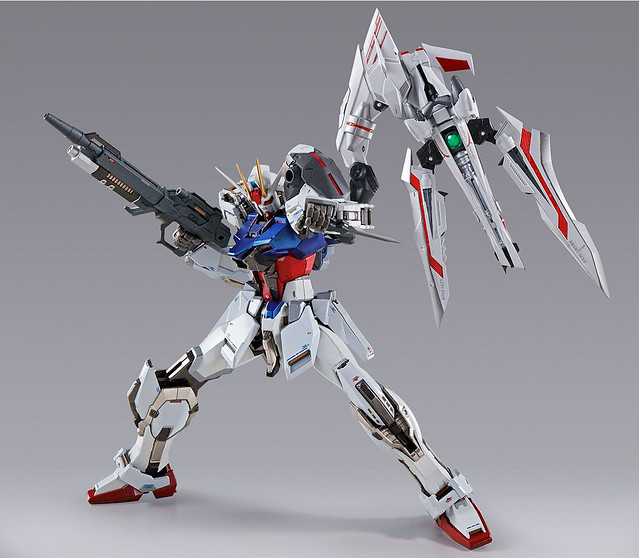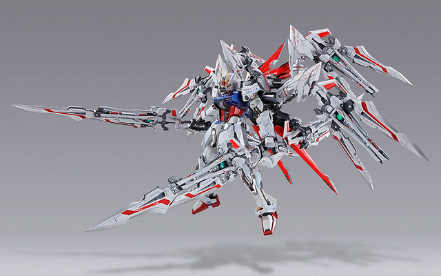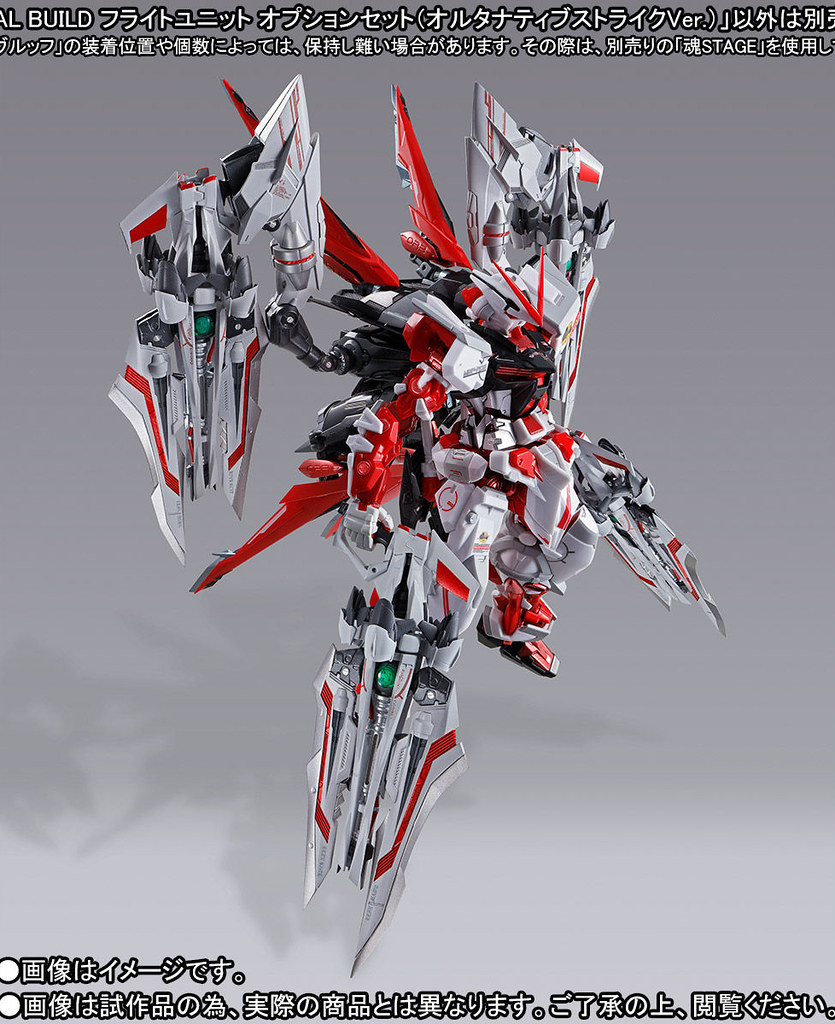 配合色彩翻新的「METAL BUILD 飛行組件 ALTERNATIVE STRIKE Ver.」即可組合出「GAT-X105+AP/Y1001+AP/Y1002 紅龍型攻擊鋼彈(飛行組件裝備)」以及「MBF-P02+AP/Y1001+AP/Y1002 異端鋼彈紅色機(飛行組件裝備)」,甚至在背包、飛行組件、肩部、雙手都能進一步搭載複數的烈雷劍,理論上最大可同時裝備 13 把烈雷劍,把玩出極為多樣的型態!