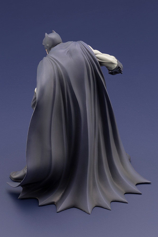 「ARTFX+ 蝙蝠俠(Hush)」高約16 公分,是把過去發行的「ARTFX+ 蝙蝠俠&羅賓」套組中的蝙蝠俠重新以《Batman: Hush》中的色調塗裝並獨立販售,原本黑色的部分變成深藍色,而胸前的蝙蝠標誌也做出了變化!蝙蝠俠本體形塑出精壯結實的線條,陰影效果則讓肌肉形狀更為立體,而緊身戰衣因為動作而產生的皺摺也逼真再現,黑暗騎士蓄勢待發的備戰姿態實在超帥氣呀!