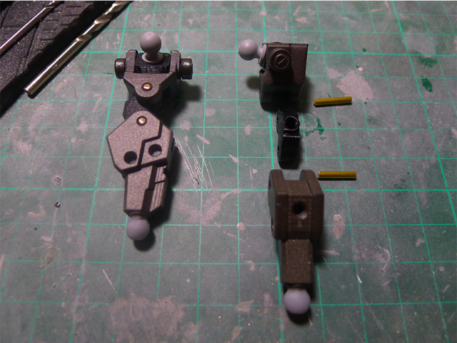 手臂的組裝,為了讓成品有更高的活動性,肩膀的連接處採用球頭及自製的軟膠關節與軀體作連接,上臂及下臂也各塞入一個軟膠關節與肩膀及拳頭連接,手肘的部分也是自製的軟膠關節,這些複雜的設定都是為了確保成品的可動度而作的分件;