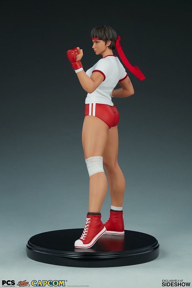 「春日野 櫻 體育服版 1/4 比例全身雕像」高約41.9 公分,整體的動作呈現與高校制服版相同,展現出她全神貫注、緊握雙拳的備戰姿態,合身的白色T-Shirt 在胸前還有「春日野」的名牌,短短的紅色運動褲讓本作的青春氣息再提升XD!除了頭帶變成紅色樣式之外,左腿、右腳踝....等處還有白色裹布,加上附屬的兩種頭雕、白色外衣與黑色腰帶,能有多種展示選擇!EX版還有一幅施展昇龍拳的畫作喔。