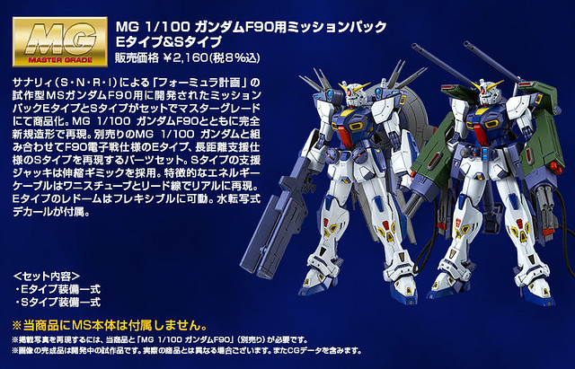 「MG 1/100 鋼彈F90用E型&S型任務背包擴充套組」則收錄了電子戰用的 E 型(Electric Type)、長程支援戰規格 S 型(Support Type)兩款任務背包,由大河原邦男老師更新設計,E 型的雷達、電子干擾步槍;S 型的遠程光束砲、導彈都以 MG 等級規格再現,能夠裝備於另售的「MG 1/100 鋼彈F90」全身設置的硬點。