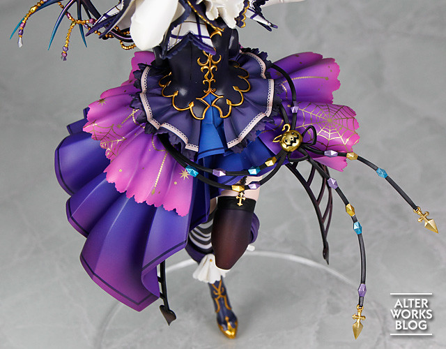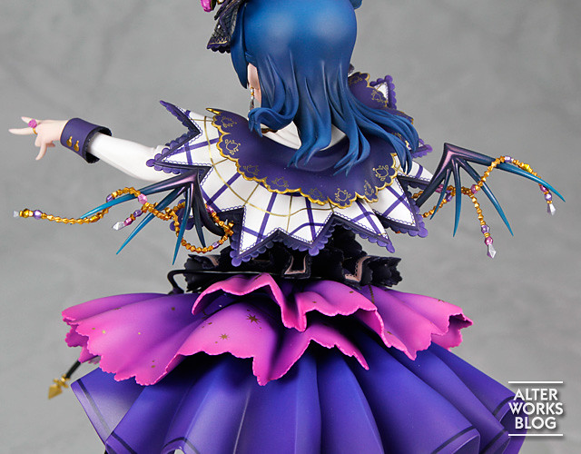 「津島 善子 1/7比例模型」以《LoveLive! 學園偶像祭》遊戲中 UR<萬聖編>覺醒後的卡面插畫為基礎製作,忠實再現中二滿點卻不失質感的特殊服裝。以紫色為基調的萬聖衣裝使用不同彩度變換、漸層塗裝,並雕塑出精緻的蕾絲、荷葉邊、拉鍊、飾品造型,造型密度極高,並透過亮眼的金色點綴,印刷出奇幻風格的星空、蜘蛛網圖樣,相當華麗,配合夜羽中二得意的動作、開朗無邪的笑容徹底展現角色魅力!