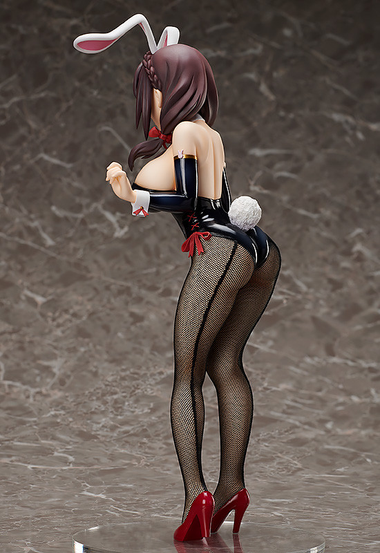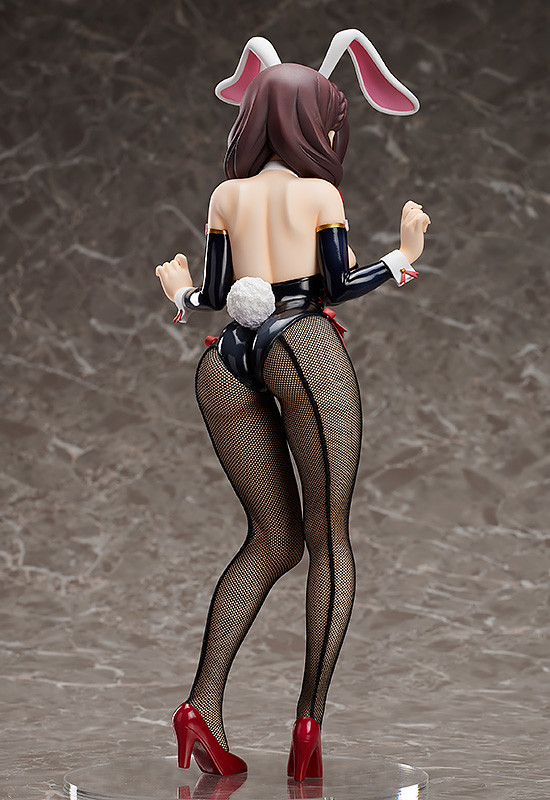 「芸芸 兔女郎Ver. 1/4比例模型」以動畫版的人設為基礎製作,將穿上性感兔女郎裝扮、露出害臊表情的芸芸立體化,黑色的兔女郎裝擁有高光澤度的表面質感,領結、側腰處使用和芸芸髮飾相近的紅色緞帶設計,以 1/4 大比例、全高370mm 的尺寸再現與惠惠極端相反的姣好身材,胸前的份量光用看得就感到壓迫不已,搭配真實布料縫製而成的網襪修飾雙腿曲線,徹底展現芸芸的美豔姿態!