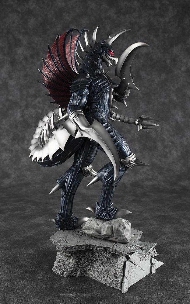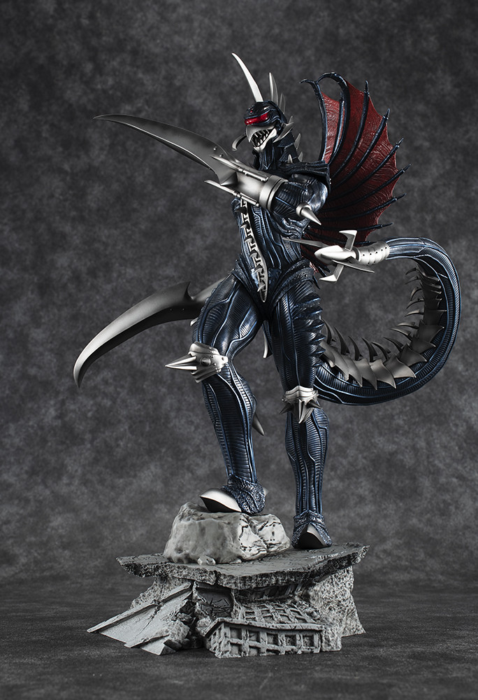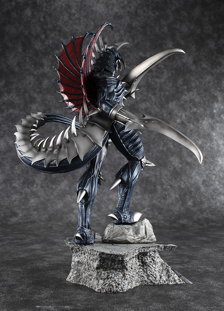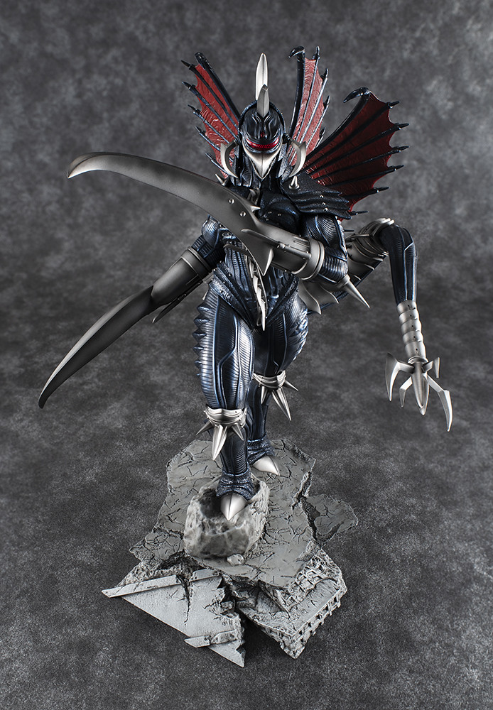 「超激造系列 蓋鋼」以劇中被哥吉拉爆頭前的造型為基礎製作,將頭身比例修得更接近人體,腿部造型相當美型,能感受到結實的肌肉感。眼罩內擁有複眼構造,體表、翅膀皆雕塑出細膩的高質感紋路,雙臂武裝、鎧甲則有銳利而厚重的造型,施以金屬藍、金屬銀塗裝後更具重量感,相當帥氣!