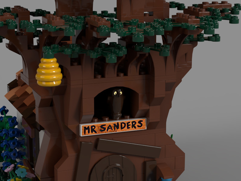 作者Ben Alder 是以「benlouisa」的名稱在LEGO IDEAS 平台投稿這次的創作,目前已經累積到4000多票,他以動畫中最有記憶點的場景之一「小熊維尼的樹屋」為創作主體,並附上了小熊維尼與他的好朋友們:跳跳虎、瑞比、小豬、屹耳,以及藏身在樹幹中的貓頭鷹;先來看看場景吧~以大量褐色磚、樹葉零件堆砌出的樹木巧妙地用上斜面磚勾勒出逼真的樹幹與枝條輪廓,還有蜂窩零件點綴著,而且「MR SANDERS」的名牌也忠實還原囉!