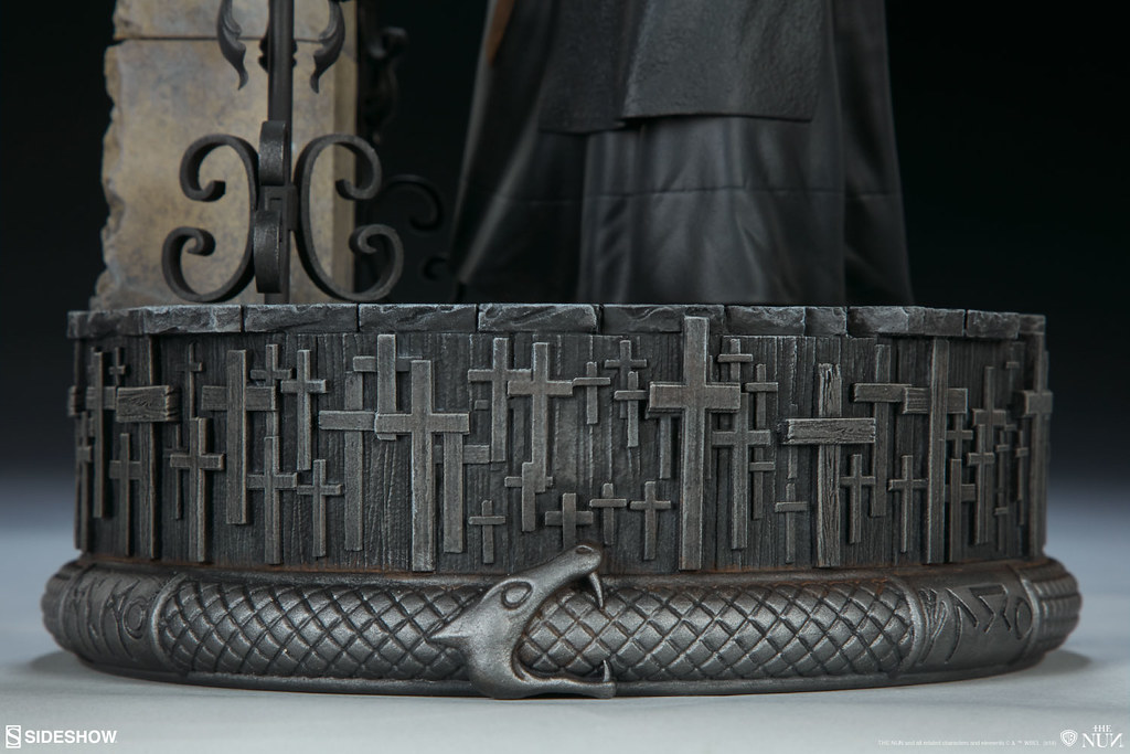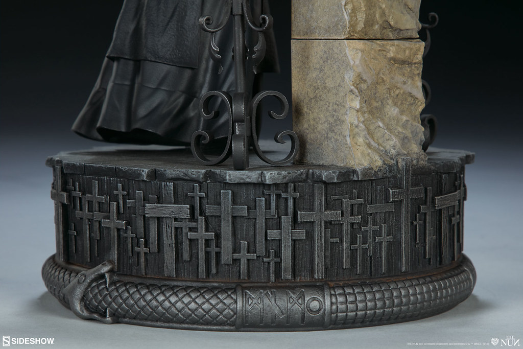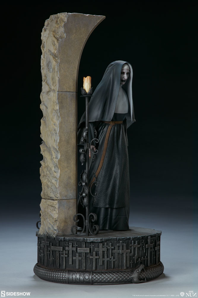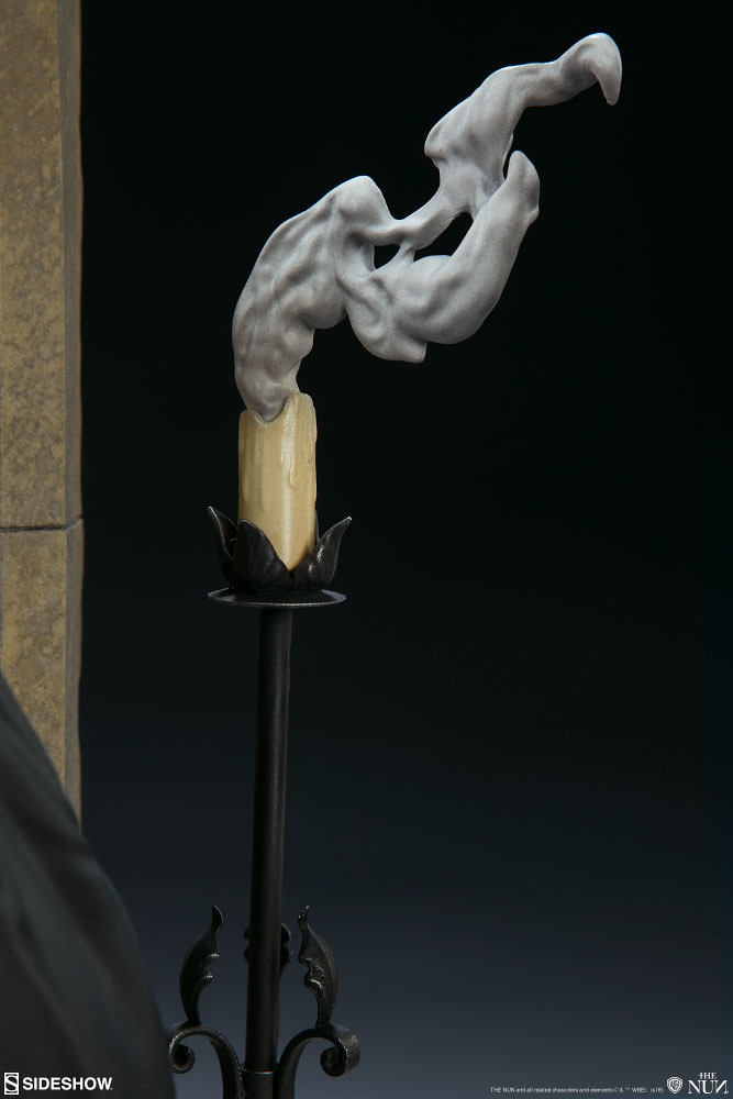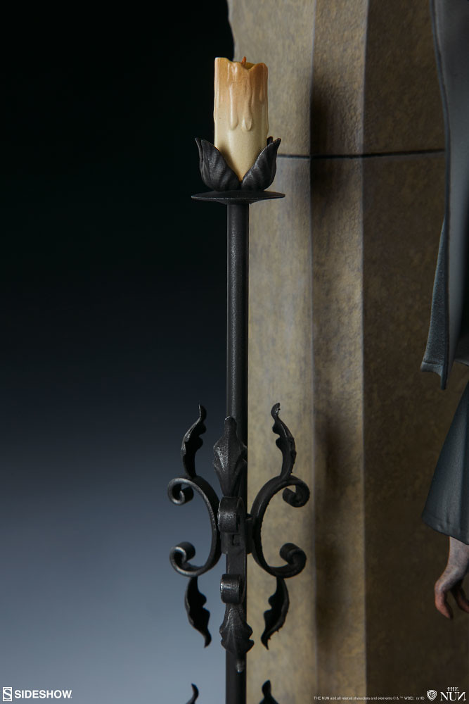 「鬼修女 全身場景雕像」高約34.2 公分(含場景地台),再現了劇中鬼修女蒼白、恐怖的面容,漆黑的嘴、發黑的手指、黃色的指甲......等更是帶給人強烈的陰森氣息!修女服形塑出逼真皺褶與走動時所產生的飄揚感,以修道院走廊為題製作的場景地台也有著豐富、寫實的細節,以精湛的塗裝展現出地板、石柱、燭台的不同質地,有意思的是,在鬼修女身後的蠟燭還呈現出火焰熄滅後煙霧飛散的狀態!增高的底座圍繞著大量十字架,最底下還有「銜尾蛇(ouroboros)」的立體雕刻十分豪華,而EX版則附屬了一顆張開血盆大口、恐怖指數大升級的頭雕啊~