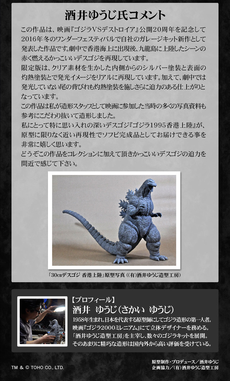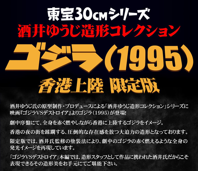 「酒井裕司造型收藏 哥吉拉(1995) 香港上陸」由人氣怪獸造型作家酒井裕司(酒井ゆうじ)擔任原型製作,將自家公司於 2016 年推出的 GK 作品商品化,再現電影一開始哥吉拉登陸香港九龍、在夜晚閃耀紅光蹂躪城市的經典場景。商品大幅再現原型的細節,兇猛的頭部、細膩的體表紋路極具魄力,並運用塗裝呈現發出紅光的高溫體表。