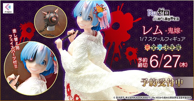 系列之前推出過「雷姆 白無垢版本」,這次將其造型整個轉化成特殊的"鬼嫁造型"!頭髮部份運用透明材質來製作,頭上還冒出了"角"、手拿著有特殊長鏈的流星錘,有兩款不同頭雕配件可以替換,此作將於fnex官網以完全受注生産方式販售,喜愛《Re:從零開始的異世界生活》系列作品的玩具人千萬別錯過了啊!