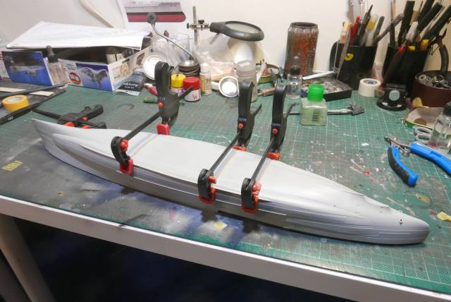 一艘船的開工總是從艦體開始,艦體開得很漂亮,不過因為是左右舷兩片分開,所以安裝時還是需要F夾來輔助固定,在這裡艦體與支撐的接合處開得有點緊,密合的時候如果沒有壓緊在艦底會出現一條大縫.接縫處理算是艦身基本工程裡面比較需要多用心的部分。