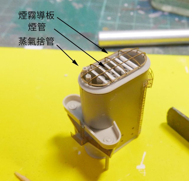 煙囪部內側空空如也,如果沒有作構造進去看起來會一片空白,所以用原件炮管作成煙管,再用膠板作煙霧導板