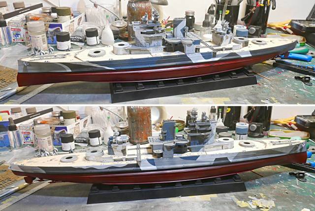 迷彩的塗裝這裡我沒有拍到製作過程,不過在這裡我用了艦體灰、藍灰色、白色與深灰四種顏色,觀察顏色指示說明書後分層來噴,首先噴上艦體灰,遮蓋出輪廓後噴上白色、接著再遮蓋再噴藍灰與深灰,總之迷彩的作業便是重複地遮蓋輪廓,一層一層將顏色噴上去。