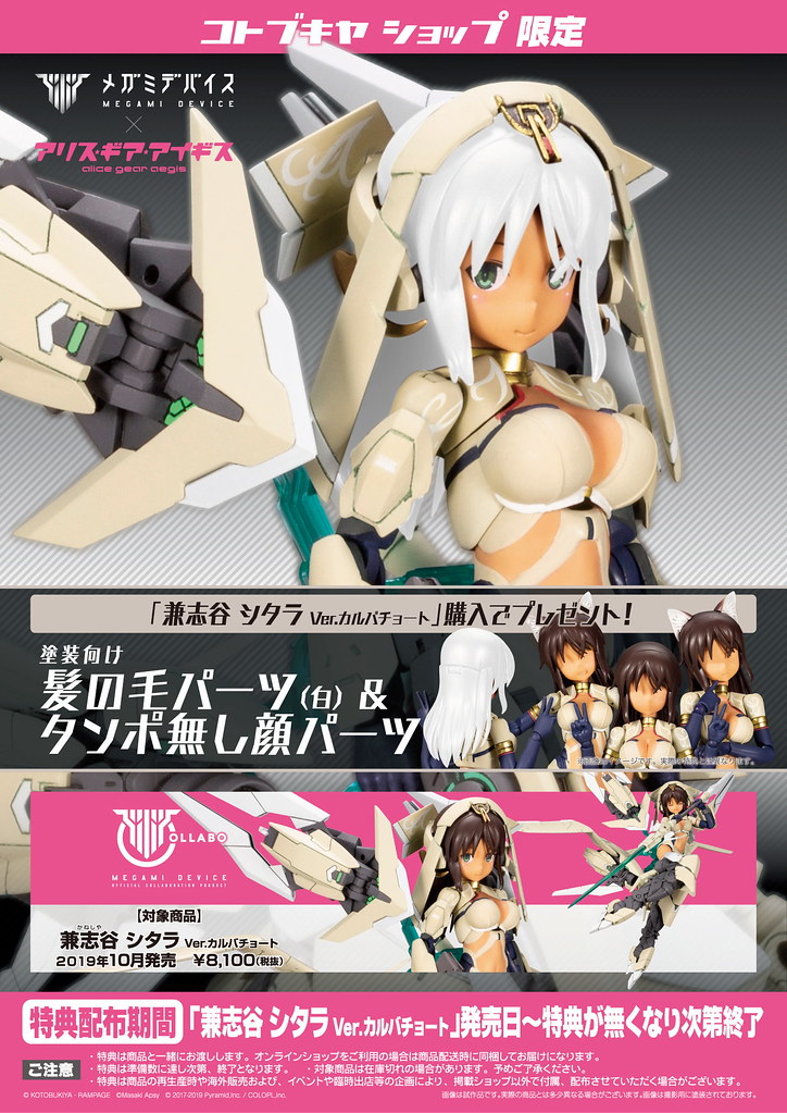 由日本壽屋玩具公司(KOTOBUKIYA)發行,結合機械與美少女的組裝模型系列『女神裝置(メガミデバイス)』繼「吾妻楓」後,今(16)日再度發表了與手機遊戲《機戰少女Alice》第二彈合作商品「女神裝置 兼志谷星 Ver. Karva Chauth」預計於 2019 年 10 月發售的消息。