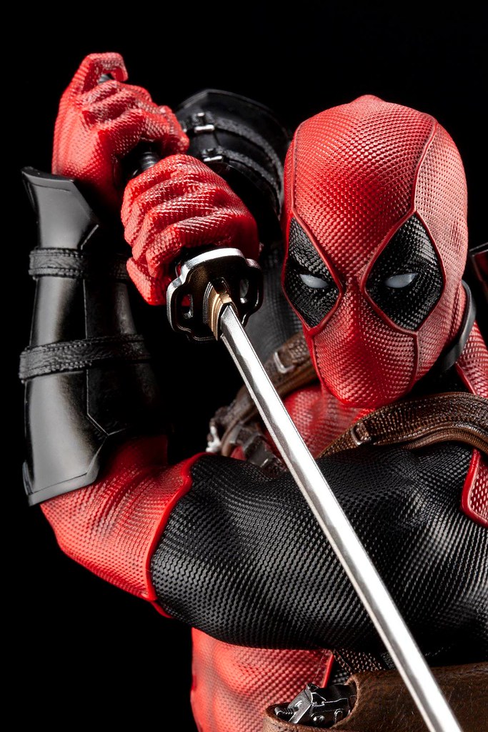本作高約27.5 公分,雙手持握日本刀、壓低重心的死侍給人戰鬥一觸即發的視覺張力,緊身衣的紋路雕刻與逼真皺褶、結實肌肉線條的形塑、槍套與腰際口袋等部分的皮革質地、日本刀護手和刀身的金屬感與光澤,完全可說是擁有不愧對於 “マキシマム” 之名的表現!從各個角度欣賞都令人滿意,岩石地台也有著寫實的造型,超讚啊!