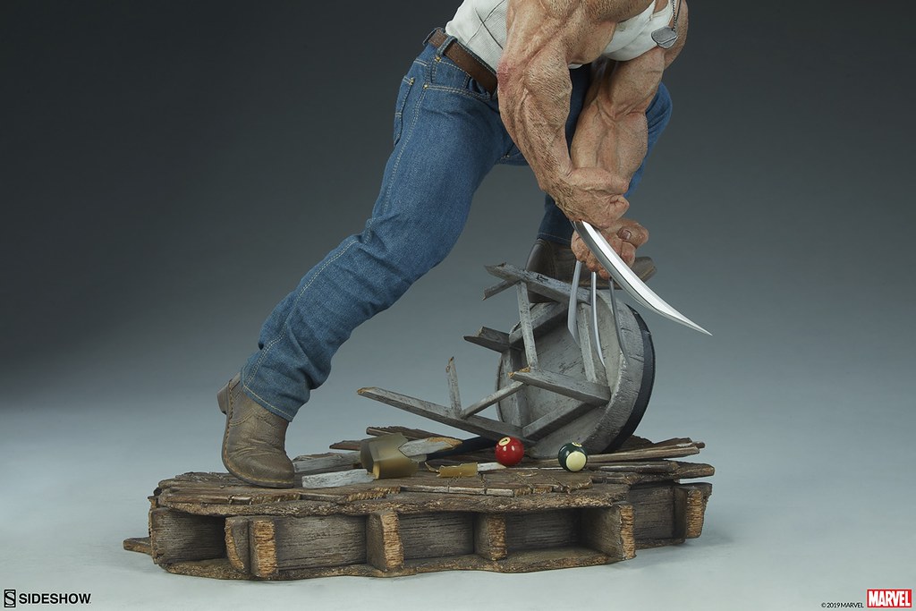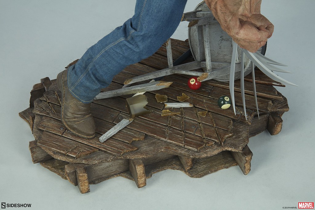 「Premium Format™ Figure 羅根」高約38.1 公分,是以羅根在酒吧裡引起騷動為主題設計,伸出鋼爪、怒吼的他左腳還踩著一張在椅墊上留有爪痕的殘破凳子,加上他前傾的姿態、雙臂爆起的青筋,完美展現出羅根的火爆脾氣,整體極具威懾感!白色背心有著精準的雕刻與破損髒污,牛仔褲採用布料製作,有著逼真的縫線細節,鋼爪則施以厚重的金屬感上色!酒吧木頭地板的場景地台展現出寫實質地,上頭散落著破碎的杯子跟撞球;EX版還追加了一顆看起來極度想要大鬧一場的壞笑頭雕!