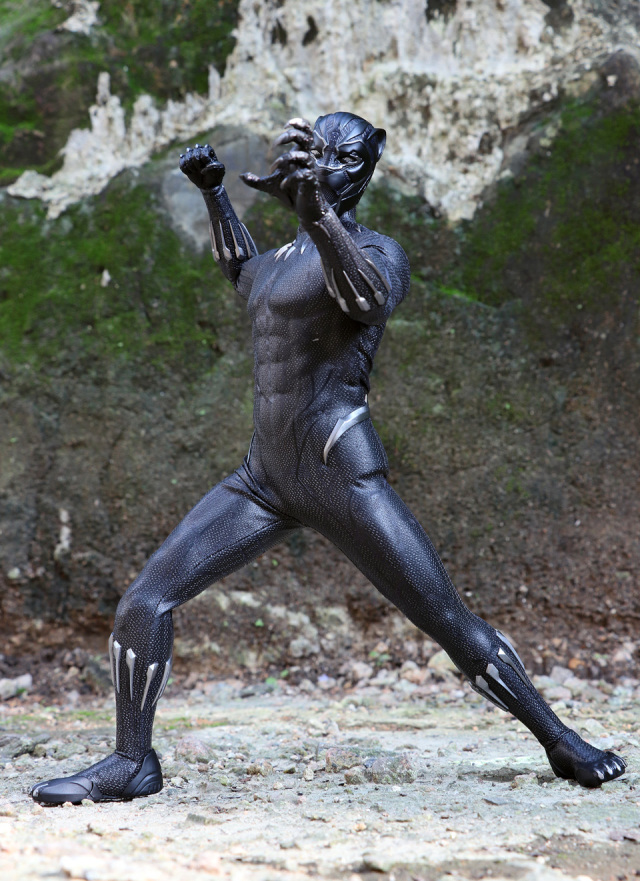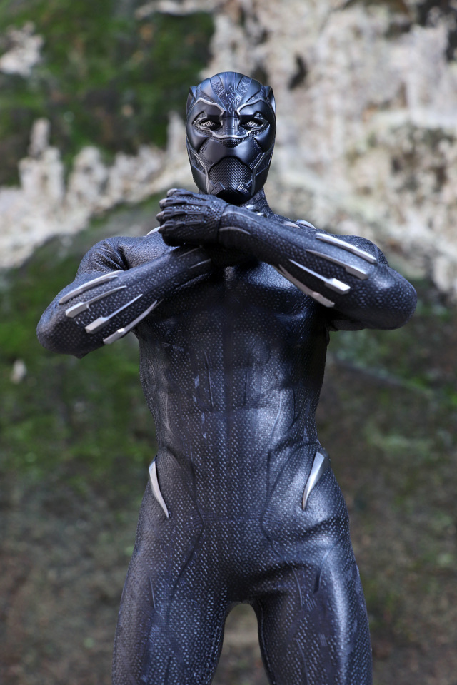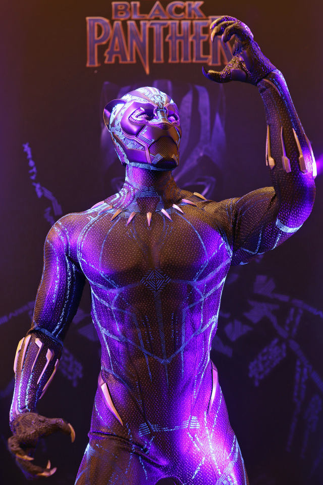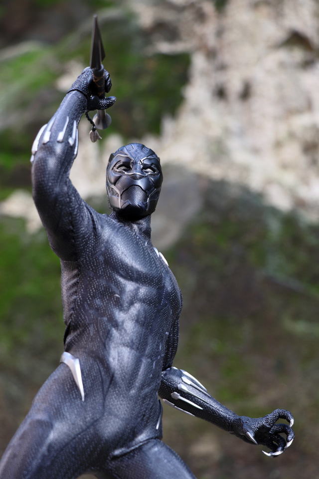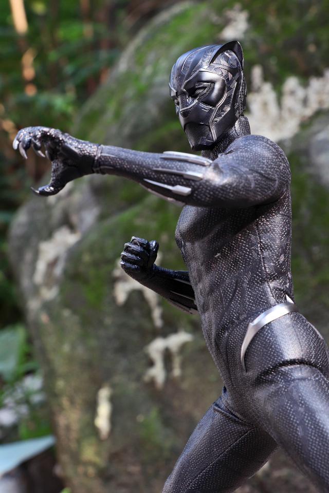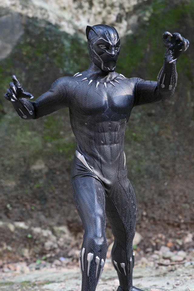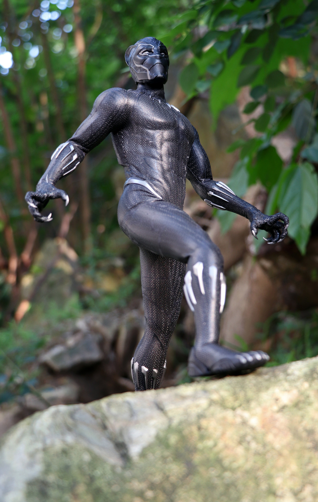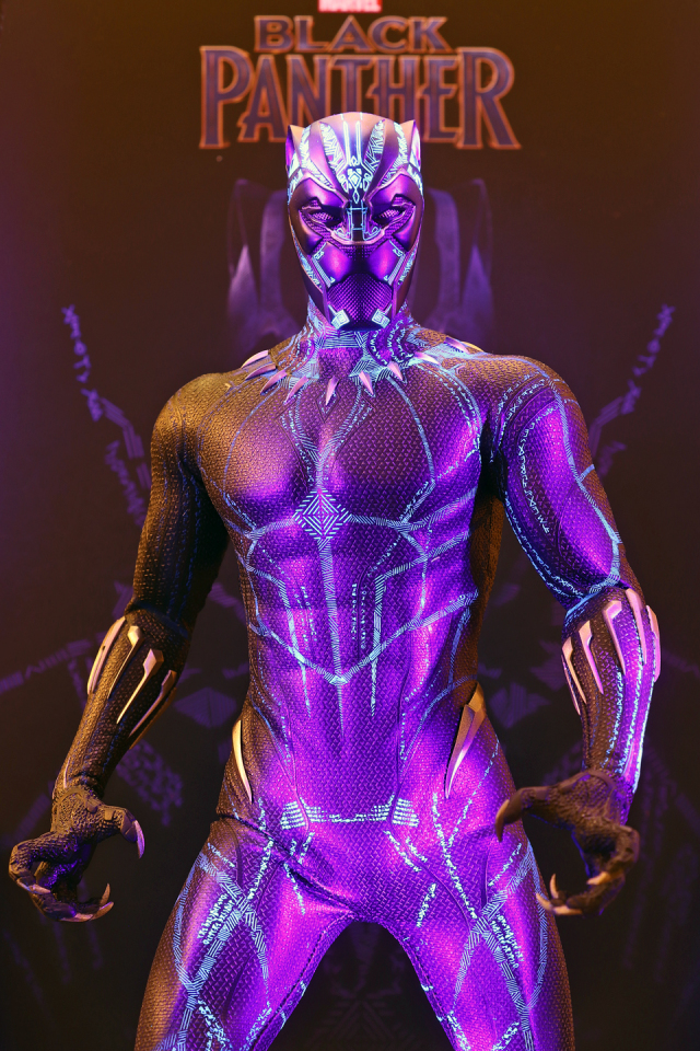 這款黑豹最大的亮點是其汎合金戰衣!它結合了螢光特效塗裝,只要放置於附屬的造型地台並以內置 LED 燈光照射,整套戰衣即可呈現出搶眼的紫色圖案和線條紋理,故無論可觀性和可玩性都非常之高。另外其可動性亦不俗!關節分佈以真人為藍本,故可任意擺放任何姿勢,但因皮套關係或多或少影響了他的活動能力!不過關節在我喪扭的情況下未見鬆散,但要經過一段時間後再行確定!另戰衣的造型細節還原了電影設定,值得一讚的是其手碗的包膠設計,兼顧了外觀和手碗的可動性。惟衣服材質的耐久性是一個問題......
