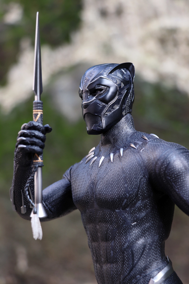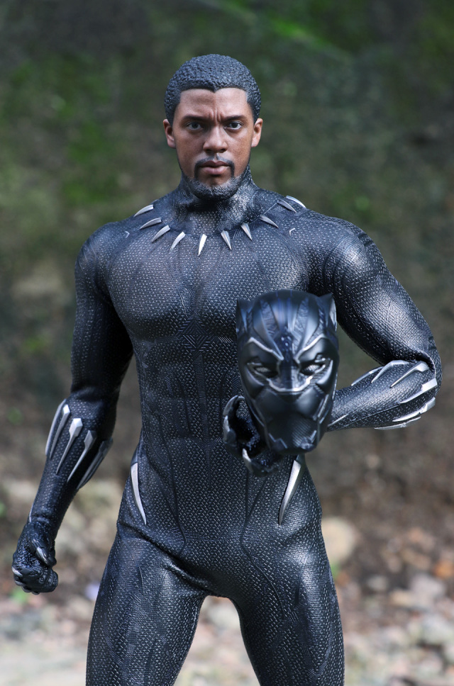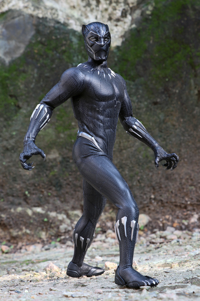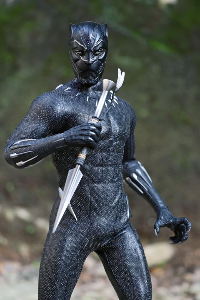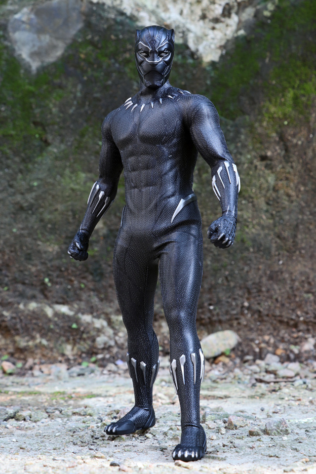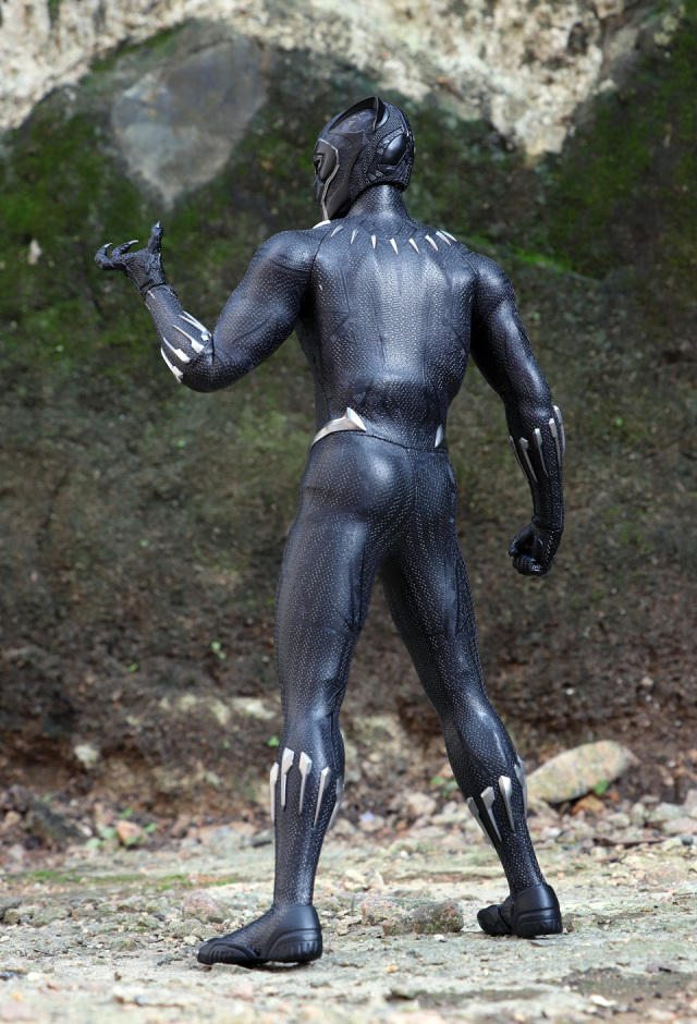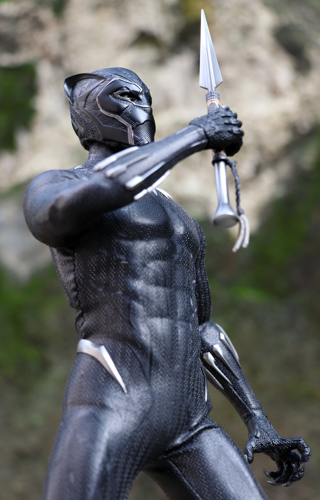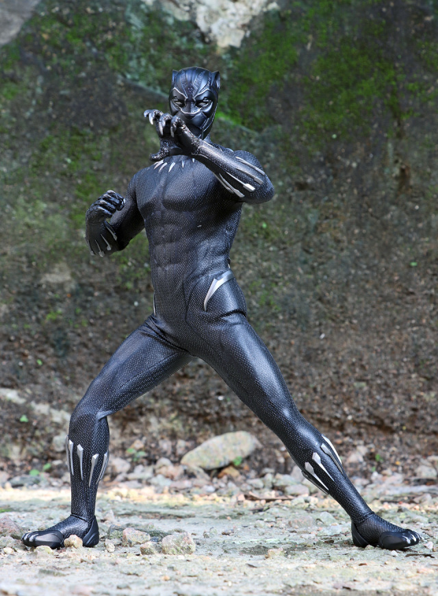 這款黑豹最大的亮點是其汎合金戰衣!它結合了螢光特效塗裝,只要放置於附屬的造型地台並以內置 LED 燈光照射,整套戰衣即可呈現出搶眼的紫色圖案和線條紋理,故無論可觀性和可玩性都非常之高。另外其可動性亦不俗!關節分佈以真人為藍本,故可任意擺放任何姿勢,但因皮套關係或多或少影響了他的活動能力!不過關節在我喪扭的情況下未見鬆散,但要經過一段時間後再行確定!另戰衣的造型細節還原了電影設定,值得一讚的是其手碗的包膠設計,兼顧了外觀和手碗的可動性。惟衣服材質的耐久性是一個問題......