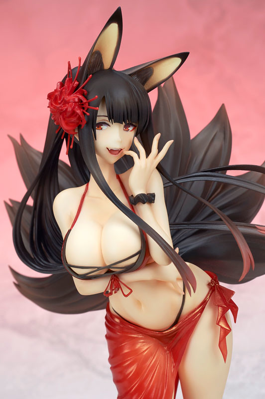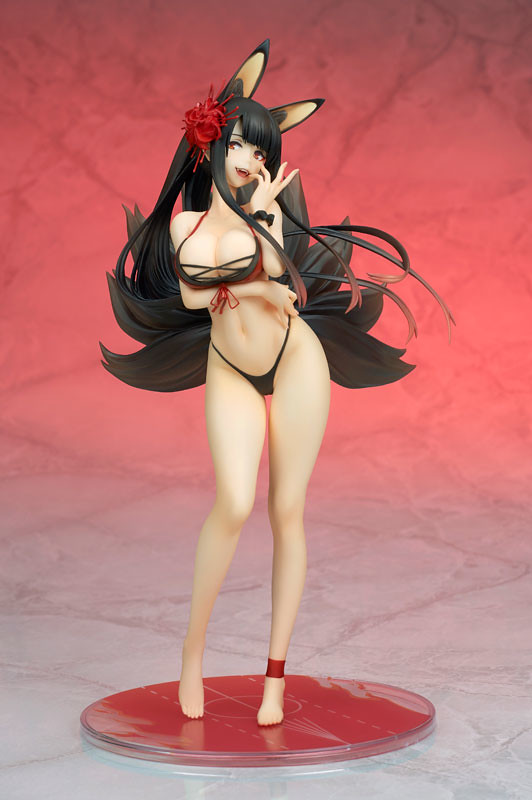 「赤城 [樂園的彼岸花] 1/8比例模型」將遊戲中的泳裝 SKIN [樂園的彼岸花]為立體化,頸部內藏關節微幅可動。妖豔的表情、輕觸紅唇的小指,搭配用手臂托住的超豐滿上圍極度性感,細膩雕塑出彼岸花(石蒜)頭飾、躍動的頭髮與尾巴造型以及姣好身材。下半身的造型從原畫的踏浪板更改為站立姿態,紗裙部份以透明零件製作,不僅能呈現朦朧的美感,還能整件脫下展露赤城大膽的泳裝!
