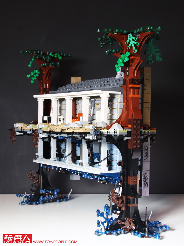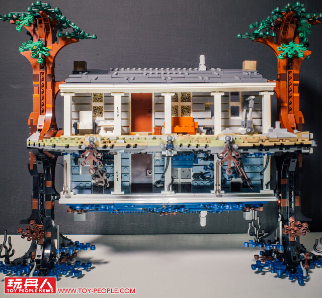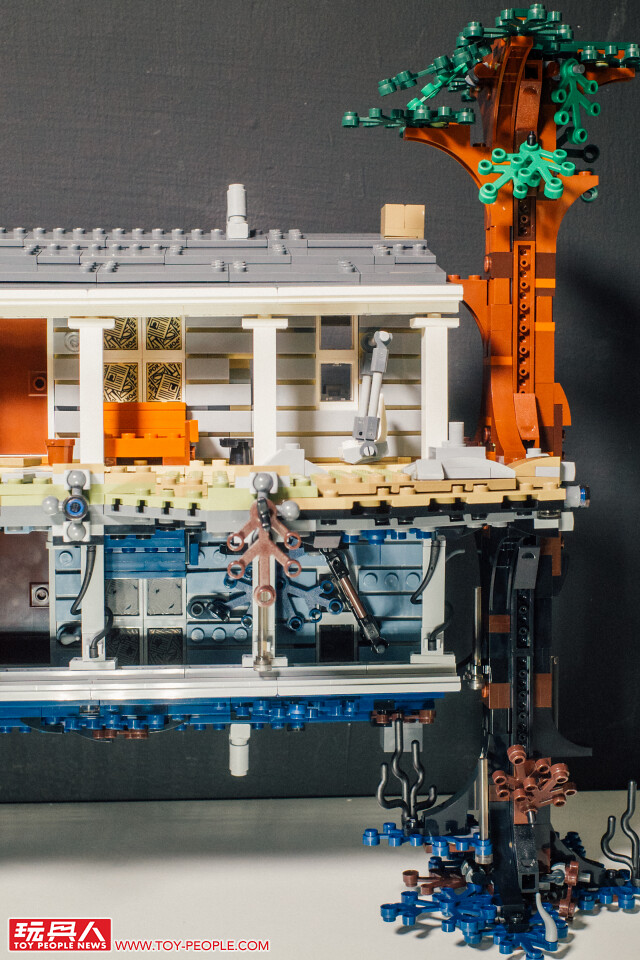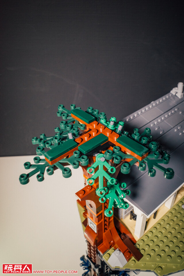 ▼現在就讓我們來看看建築物本體吧~組裝的順序是先完成上、下的屋子部分,以卡榫零件連接後,最後再用樹木來固定,小編本來還一直想說會不會不穩,沒想到整個裝完後相當地堅固,上下翻轉時也很輕鬆、容易,不怕零件噴掉。