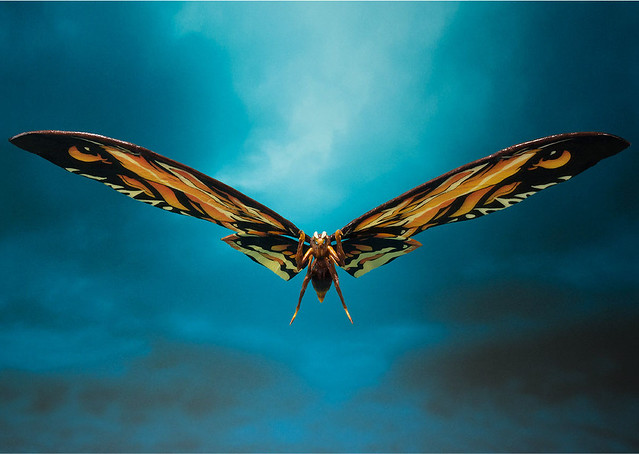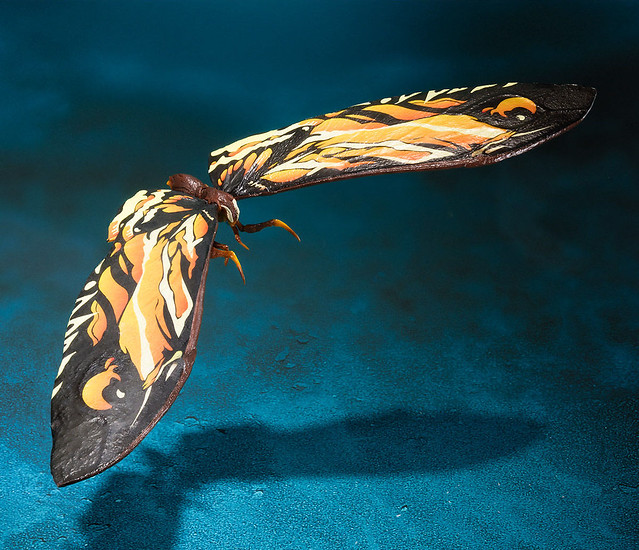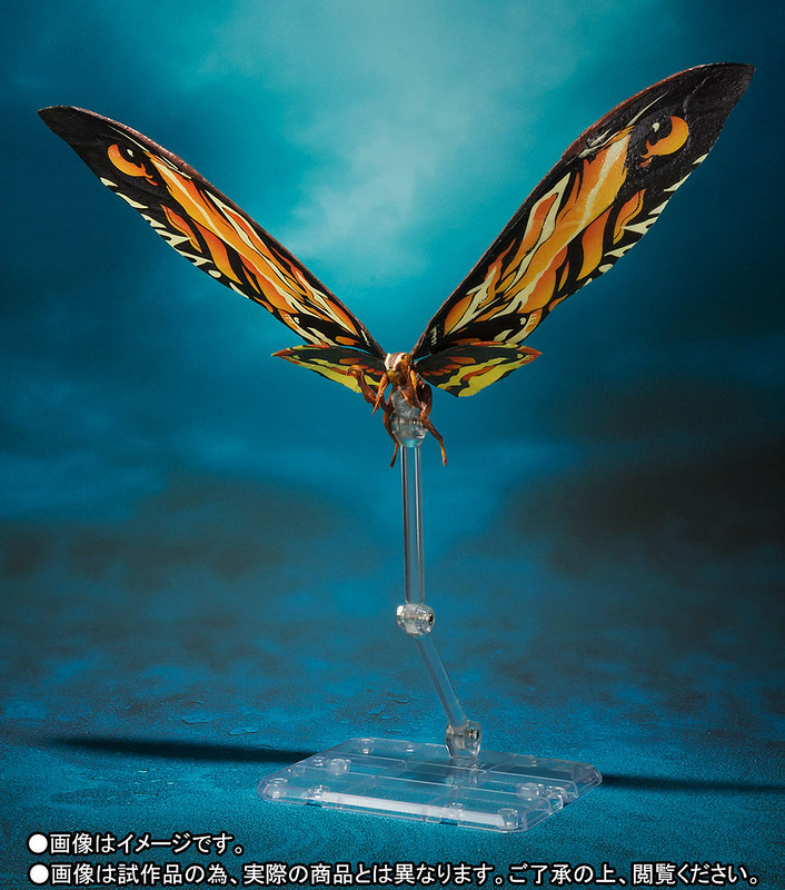 S.H.MonsterArts 摩斯拉(2019)依據電影使用的 3D 模型進行製作,將她華麗的翅膀花紋與細長足部立體化。四枚翅膀與六隻腳都設有可動的球形關節。