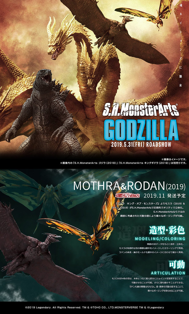 由日本 BANDAI SPIRITS 公司收藏事業部發行,結合 S.H.Figuarts 系列多年培育的可動技術與精緻怪獸造型的「S.H.MonsterArts」系列繼哥吉拉(2019)、王者基多拉(2019)後,今(30)日再度發表了出自熱映中電影《哥吉拉2:怪獸之王》的最新商品「摩斯拉(2019)&拉頓(2019)」預計於 2019 年 11 月發售的消息。