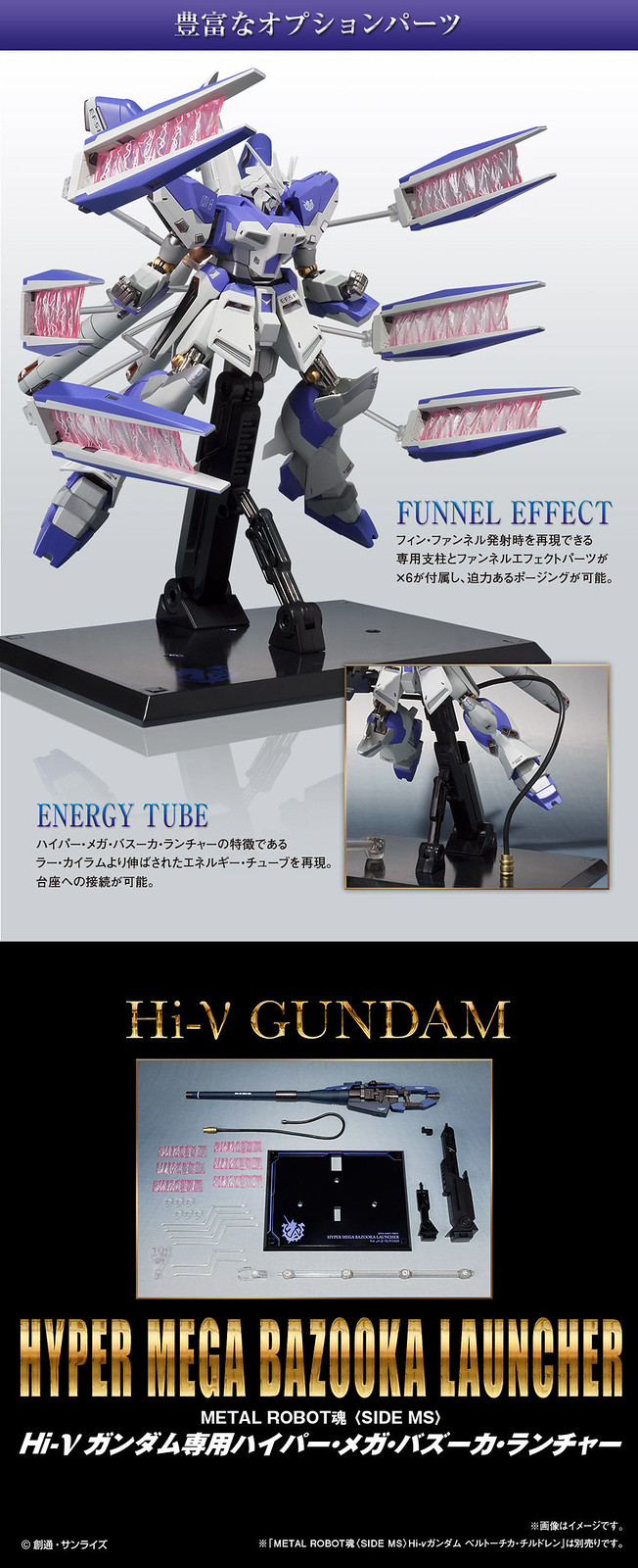 由日本BANDAI SPIRITS 公司收藏事業部發行,結合厚重金屬質感、高度造型力、 可動結構的「METAL ROBOT魂」系列繼Hi-ν 鋼彈~貝托蒂嘉的子嗣~後,今(30)日再度發表了出自小說版《機動戰士鋼彈 逆襲的夏亞 貝托蒂嘉的子嗣》的最新商品「Hi-ν 鋼彈專用超絕・MEGA・火箭巨砲」預計於 2019 年 11 月發售的消息。