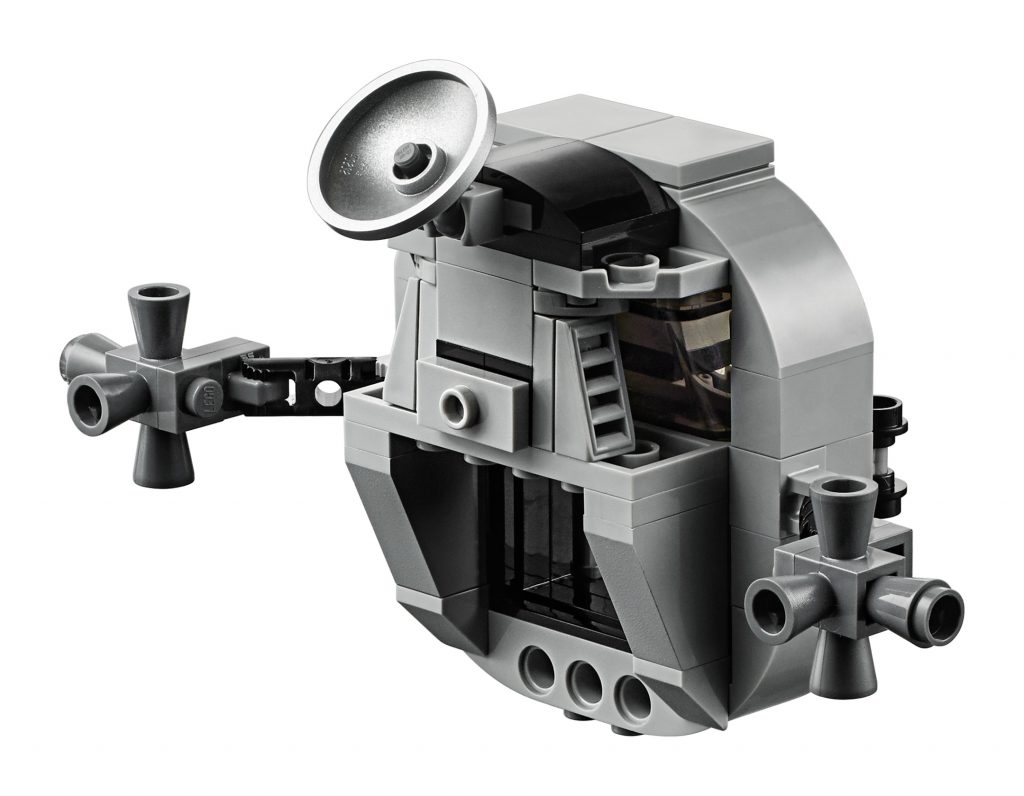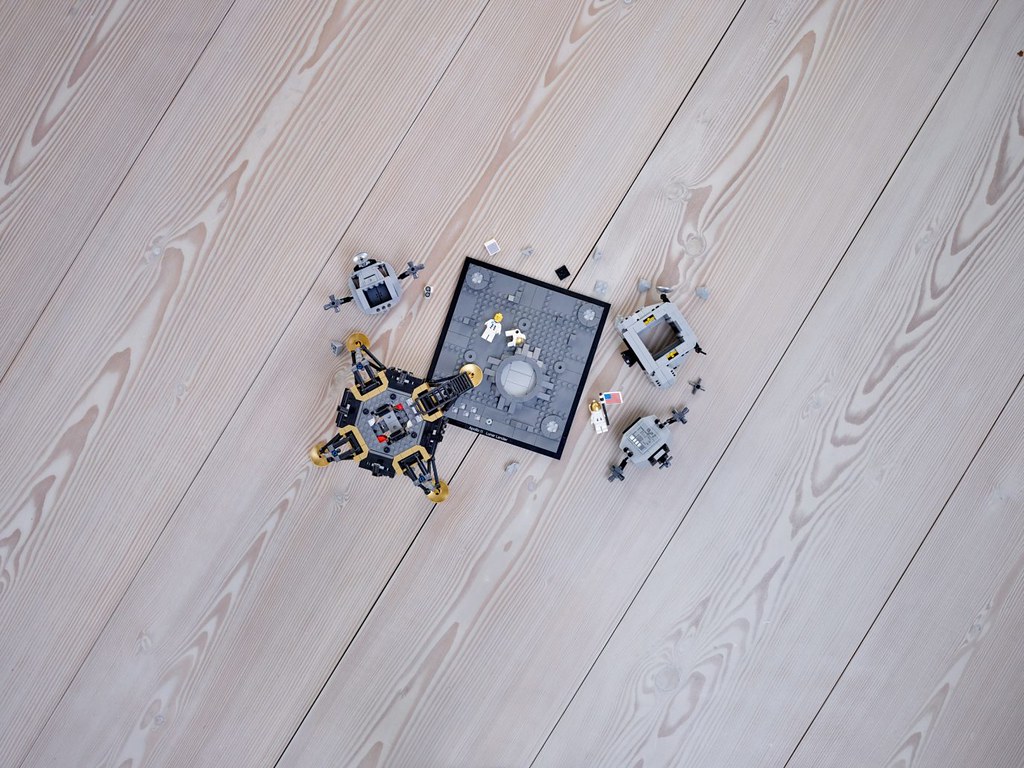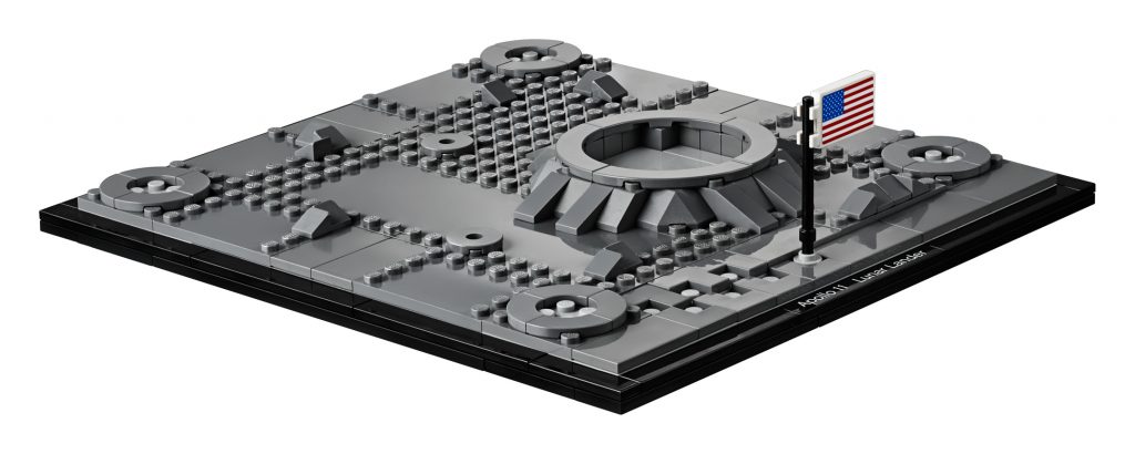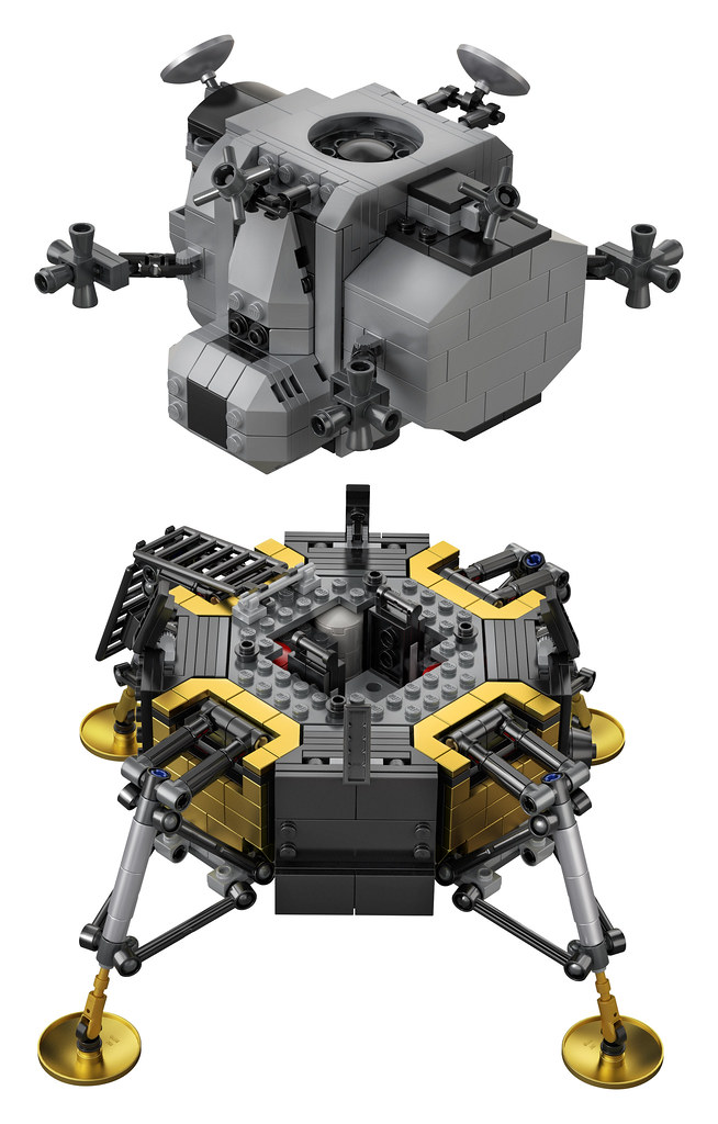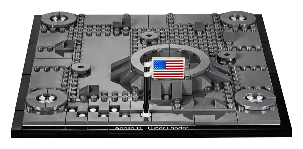 本作是樂高與NASA 共同開發,以灰、黑、金三色的零件高度複製了登月裝備中的支撐腳、金色圓板、引擎,以及雷達、天線、推進器、梯子......等登月小艇的外觀以及內裝,並還原了上升級與下降級的分離機構與能夠搭乘兩人的設計,附屬的兩個太空人偶雖沒有明確註明,我們就直接把他們當成阿姆斯壯與艾德林吧!超讚的是這盒也包含以凹凸不平月球表面為題設計的展示底座,還可以插上美國國旗!展示起來完整性再提升~!