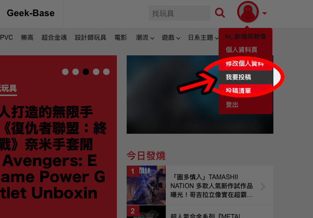 ▼將滑鼠移到右上會員帳號大頭貼,點選「我要投稿」功能即可投稿。