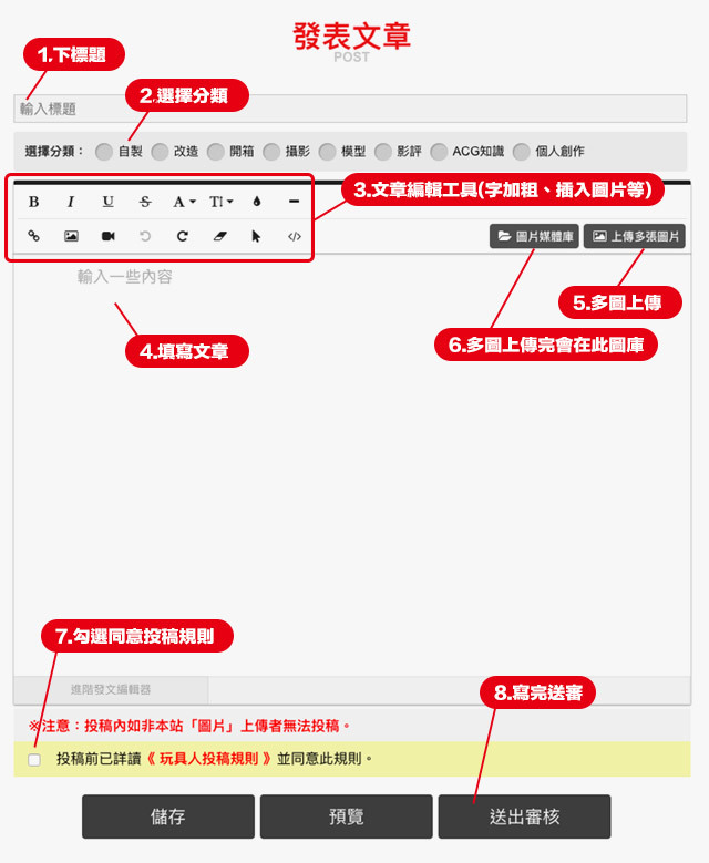 ②內容需具有原創性,如果涉及侵犯著作權時,玩具人會視情況結束刊登。