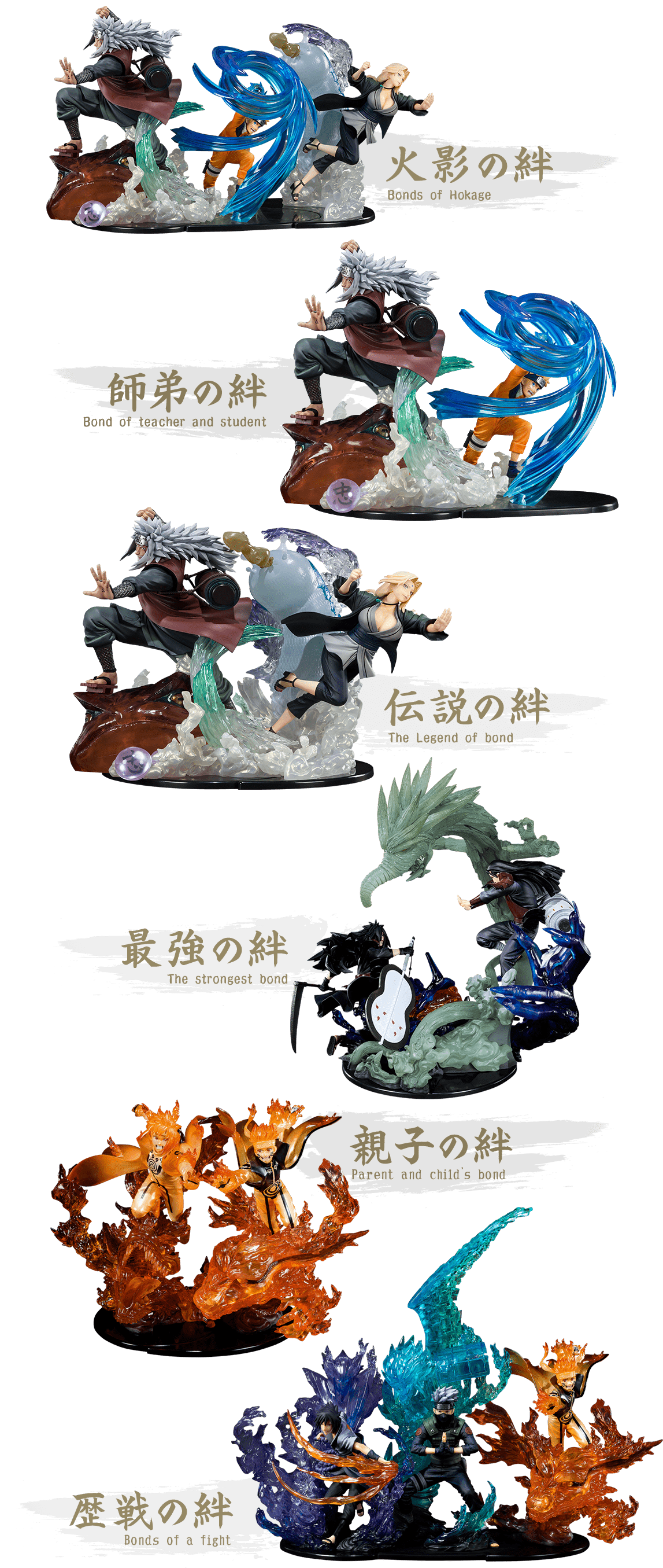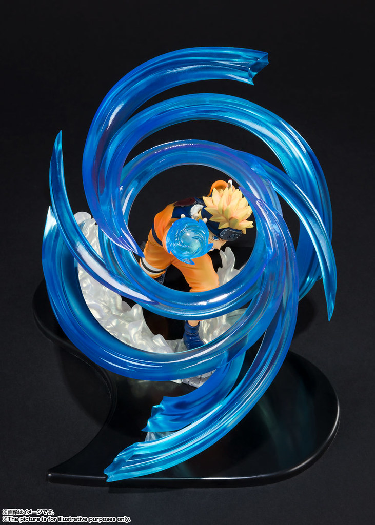 「漩渦鳴人-螺旋丸-絆Relation」高約17.5 公分,以鳴人奮力擊出位於右手的螺旋丸為題設計,藉著表現出查克拉流動的半透明藍色特效件,形塑出威力極為強大的震撼效果!服裝部分是採用第一部藍橘搭配的造型為題製作,躍動感十足的動作、堅毅的表情,加上位於腳底四周的煙霧,魄力再提升!經過設計的地台可分別與自來也、綱手結合,展現出專屬的牽絆!