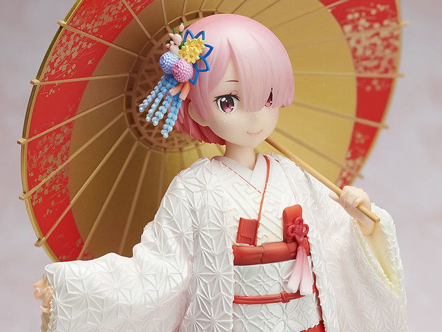 這次將特殊白無垢服裝上細緻的和服花紋飾仔細呈現,相當複雜精細的髮飾也精彩執行,還有手持著朱紅配色的紙傘配件來搭配全身白色的和服,另外還有以單腳行進的動態姿勢,以及還有綿帽子可穿脫呈現不同風貌等等,此作將於fnex官網以完全受注生産方式販售,喜愛《Re:從零開始的異世界生活》系列作品的玩具人千萬別錯過了啊!
