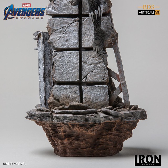 「BDS 黑豹」高約34 公分,展現出黑豹以利爪將自己固定在牆邊的靈活姿態,石塊上形塑出爪子留下的刻痕,使人感受到黑豹落下的速度感,本體根據電影設定考究地再現了於各處點綴著銀飾的戰衣,複雜的紋路也施以細緻刻畫,沾染沙塵的舊化讓本作更具大戰的氛圍,附屬了拿著奈米手套的替換左手也是大加分!場景地台部分,碎裂的岩石、外露的鋼筋擁有逼真質地,而且還設計出象徵復仇者的「A」字樣啊!