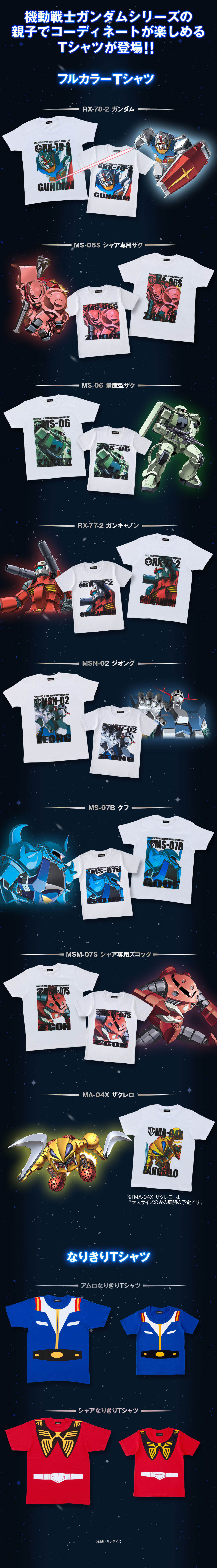 在動畫系列所登場的「阿姆羅」以及「夏亞」兩位人氣角色更是有著極高的人氣,這次特別以代表聯邦軍服裝的「阿姆羅」與吉翁「夏亞」的軍服來設計於T恤上面,另外這次也將推出多款動畫登場經典機體圖案的T恤,將會同時推出大人尺寸與小孩尺寸,讓親子們可以一起穿親子裝。此次扮演T恤,預計於Premium BANDAI線上商店在2019年6月13日起開始接受訂購,喜愛《機動戰士鋼彈》系列作品的玩具人可以參考一下歐!