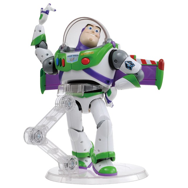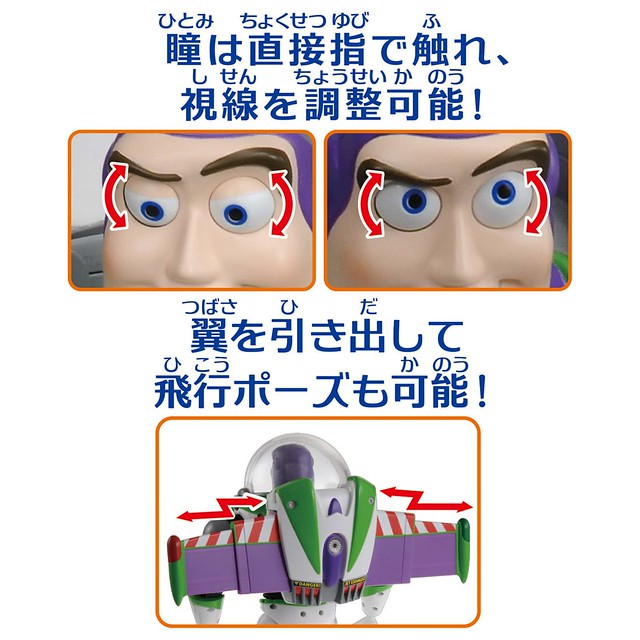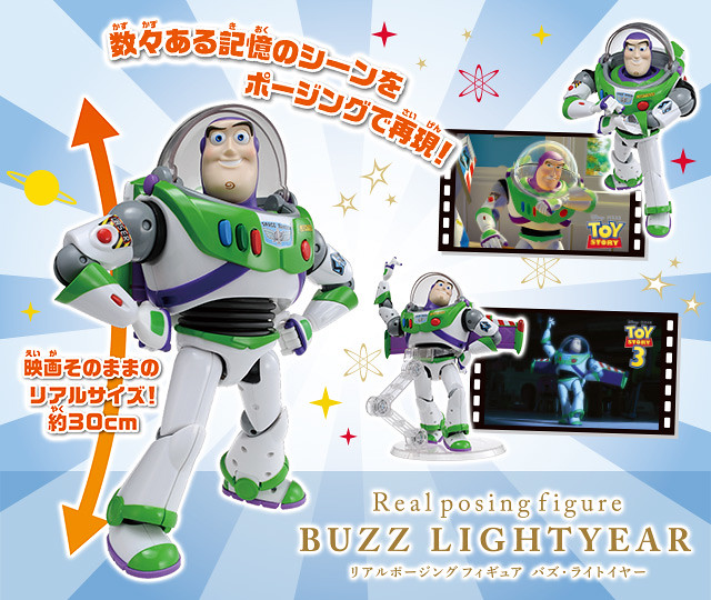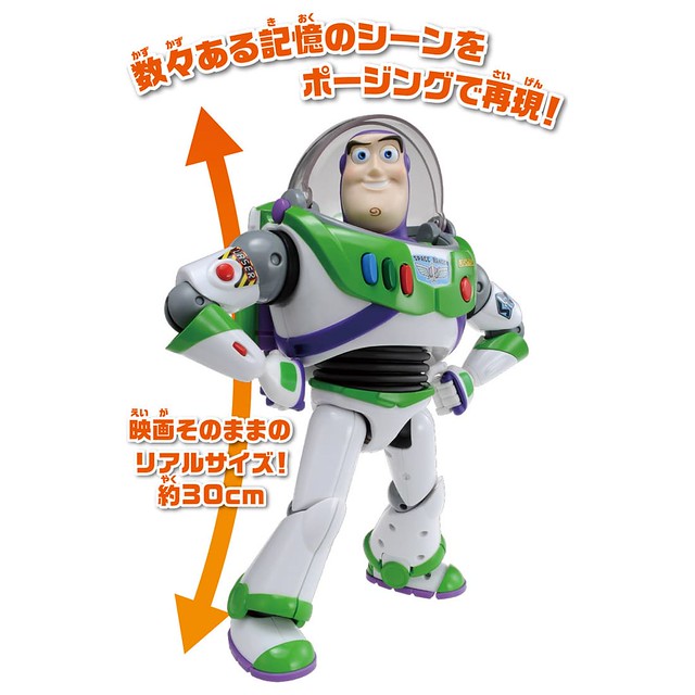 此次將以在劇中登場的實際尺寸30公分來商品化呈現,同時搭載有多處可動關節可以完整再現故事裡面的動作姿態等等,另外還有可移動眼珠的設計來改變巴斯光年的視線,背後的飛行翼也可以伸長張開,附有腳底的英文字樣貼紙讓玩具人可以任意貼出自己的名字,還原劇中主人都會在腳底寫上名字的情節,還有支撐架、底座等等配件,喜愛《玩具總動員》動畫系列作品的玩具人千萬別錯過了歐!