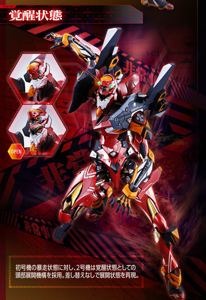與測試型的初號機不同,以實戰為考量的先行量產型「METAL BUILD EVANGELION 2號機」在設計時更加追求呈現巨大感、機能性的造型細節,兼具金屬的漂亮光澤、獨特觸感以及重量感,把玩起來更加滿足。而可動關節的設計則繼承了廣受好評的「ROBOT魂 EVA 系列」,並將可動機構重新設計更為進化,追求如同人體般靈活的可動,配合複雜的裝甲構造擺出華麗、極具躍動感的動作,讓人回想起 TV 版第九話如舞蹈般的戰鬥姿態。