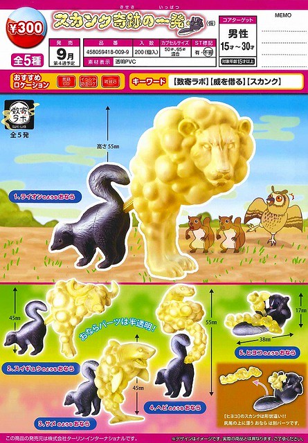 專門推出各式有趣題材轉蛋作品的EPOCH (エポック)品牌,之前以相當特殊的"壞運氣系列(数奇ラボ)"公開推出了奇怪趣味的「反骨民俗藝品」與「怪奇食材生物篇」之後,將繼續推出也是奇趣題材的「臭鼬奇蹟的一發(スカンク奇跡の一発)」轉蛋作品。