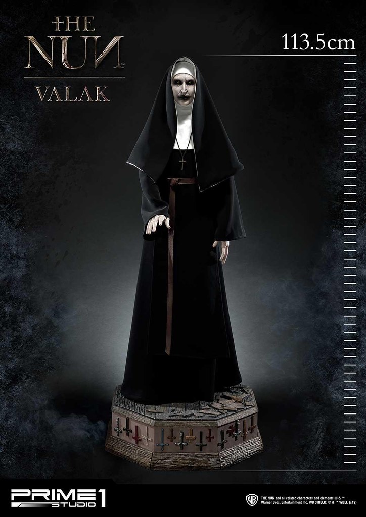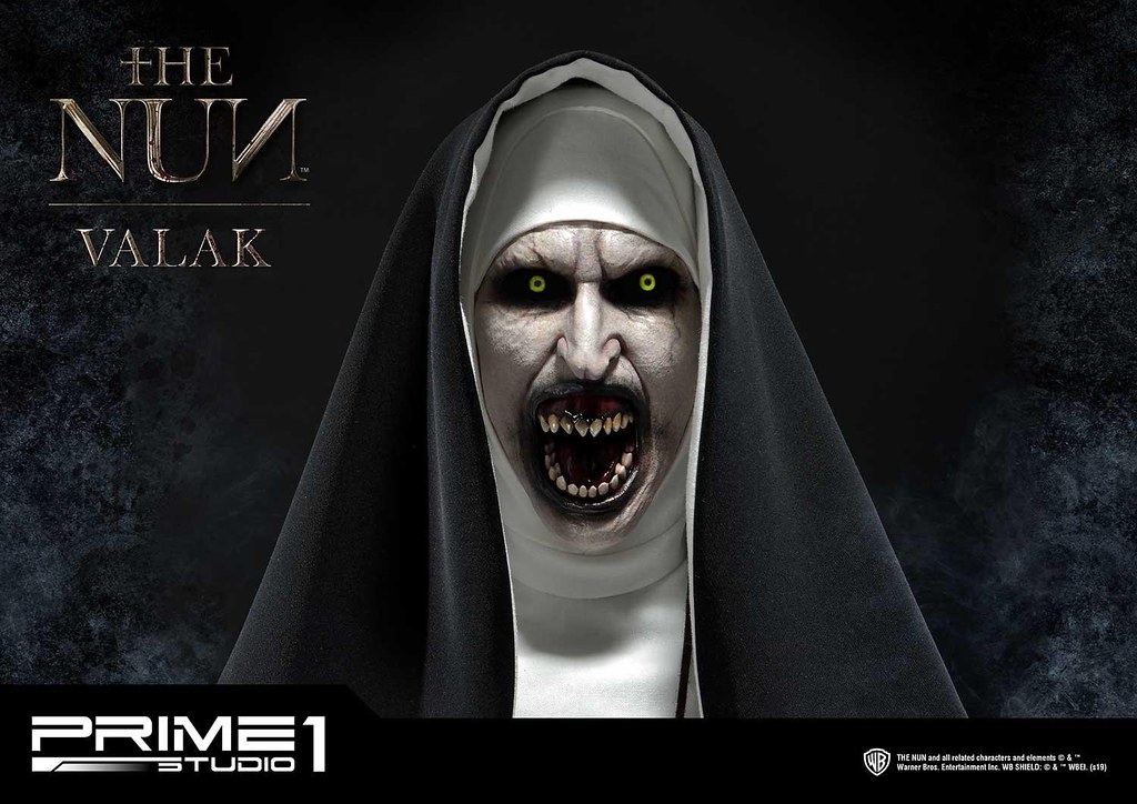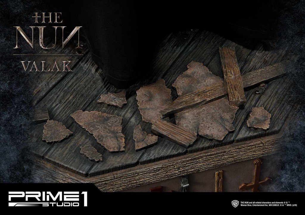 「瓦拉克 1/2 比例全身雕像」高度來到極具存在感的113.5 公分(含底座),身穿細緻的羅馬天主教修女服飾,Prime 1 Studio 以高端的製作技術展現出鬼修女極為蒼白、陰森的面容,雙眼、高聳的鼻子、眼窩與嘴唇的漆黑妝容皆讓人感到毛骨悚然,本作還附屬了另一顆露出利牙的怒吼頭雕可以替換啊~!展示底座則表現出寫實的木紋質地,還裝飾著各種顏色的倒十字架。