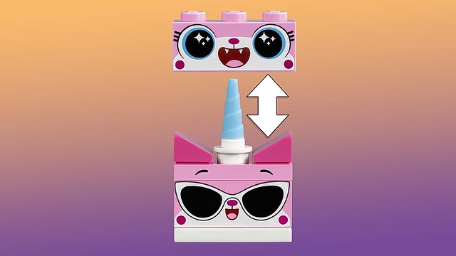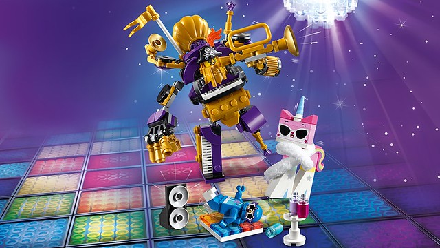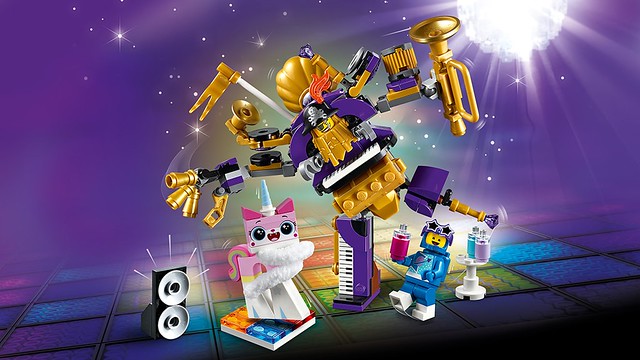 接下來則是讓小編最興奮的一組啦!當初在看電影時就想著「要是開派對造型的太空人Benny 可以人偶化的話我絕對買爆!」這款盒組同樣是主打特殊造型的人偶,再現了鬍鬚鋼(MetalBeard)、班尼、獨角貓(Unikitty) 他們在敞開心胸、享受音樂之後的繽紛樣貌製作,紫金配色的鬍鬚鋼有著鋼琴右腳、獨角貓變成了高腳造型,而且還有軟軟的圍巾?!至於班尼不只有著星星眼鏡,就連其中一個臉都變成愛心眼啦XD~超讚!